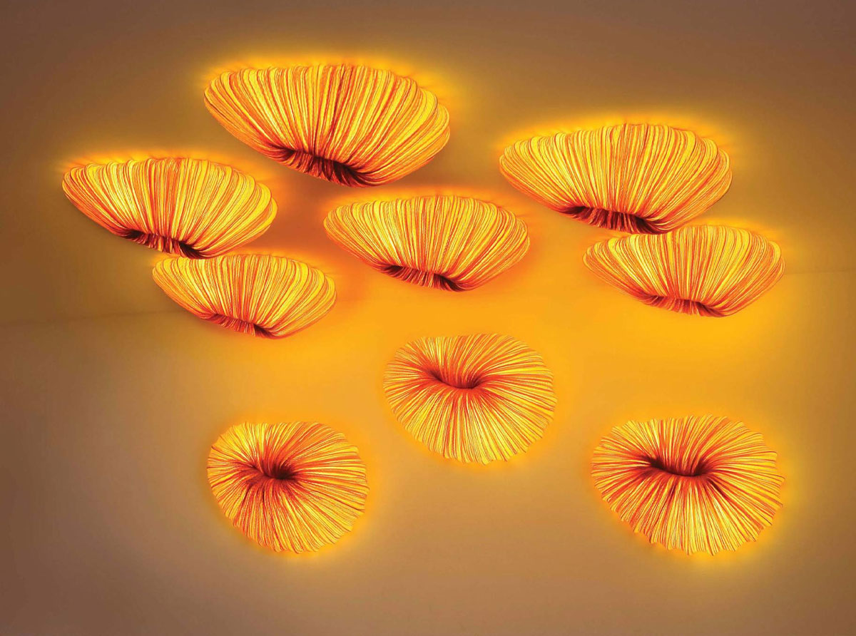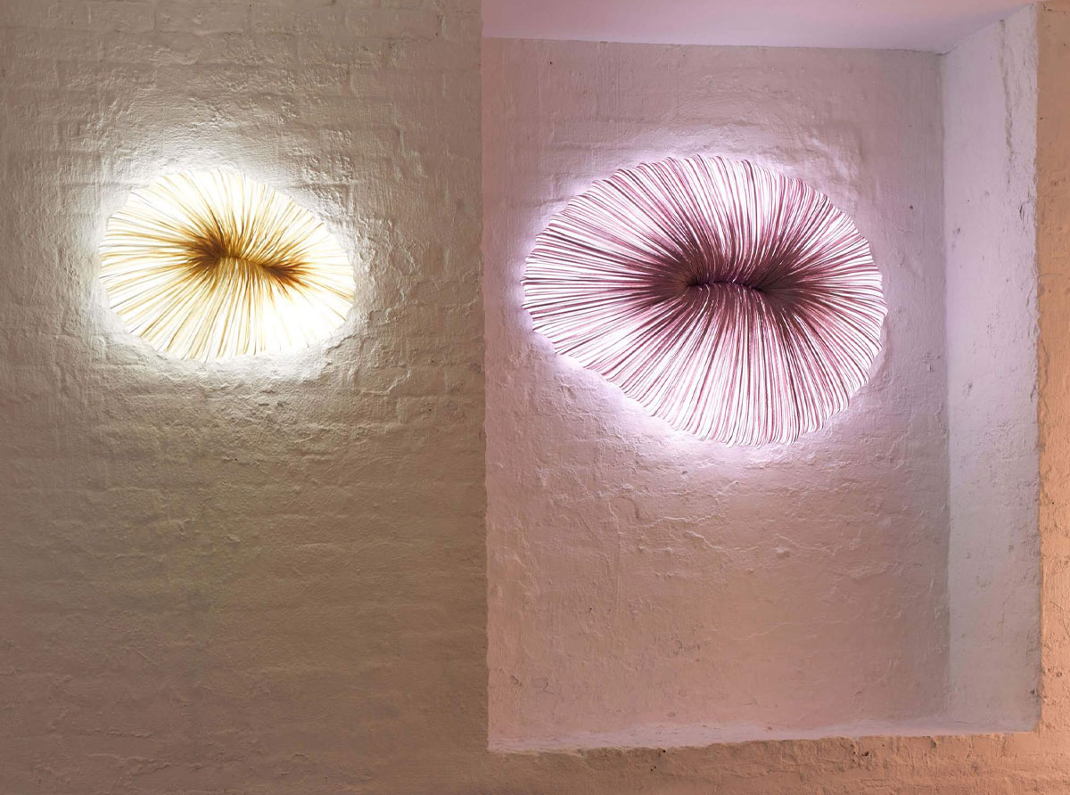 Die Aqua Creations Coral Wand- und Deckenleuchte ist Bestandteil der sehr erfolgreichen Morning Glory Kollektion der Designerin Ayana Serfaty. Morning Glory ist eine Sammlung eleganter Leuchten mit skulpturaler bzw. organischer Formgebung. Das Design der Coral Leuchte erinnert in erster Linie an Muscheln oder anmutige Meeresgetiere. An der Wand oder an der Decke angebracht, sorgt Coral für freudige Lichtstimmung. Das Grundgerüst aus Metall wird per spezieller Technik von Hand mit gefärbter Seide bezogen und in Form genäht.