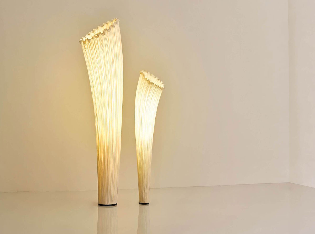 Die Aqua Creations Horn Stehleuchte gehört zu der Morning Glory Kollektion, die von der Designerin Ayala Serfaty entworfen wurde. Die organische Form der Horn Stehleuchte weckt Erinnerungen an eine überdimensionale Blume oder an Korallen aus dem Meer. Ausgehend vom Sockel ersteckt sie sich verjüngend nach oben und entfaltet sich im Leuchtschirm zu einer prächtigen Blüte. Alle Leuchtenschirme aus dem Morning Glory Programm werden stets von Hand gefertigt, gefärbt und in Form genäht.
