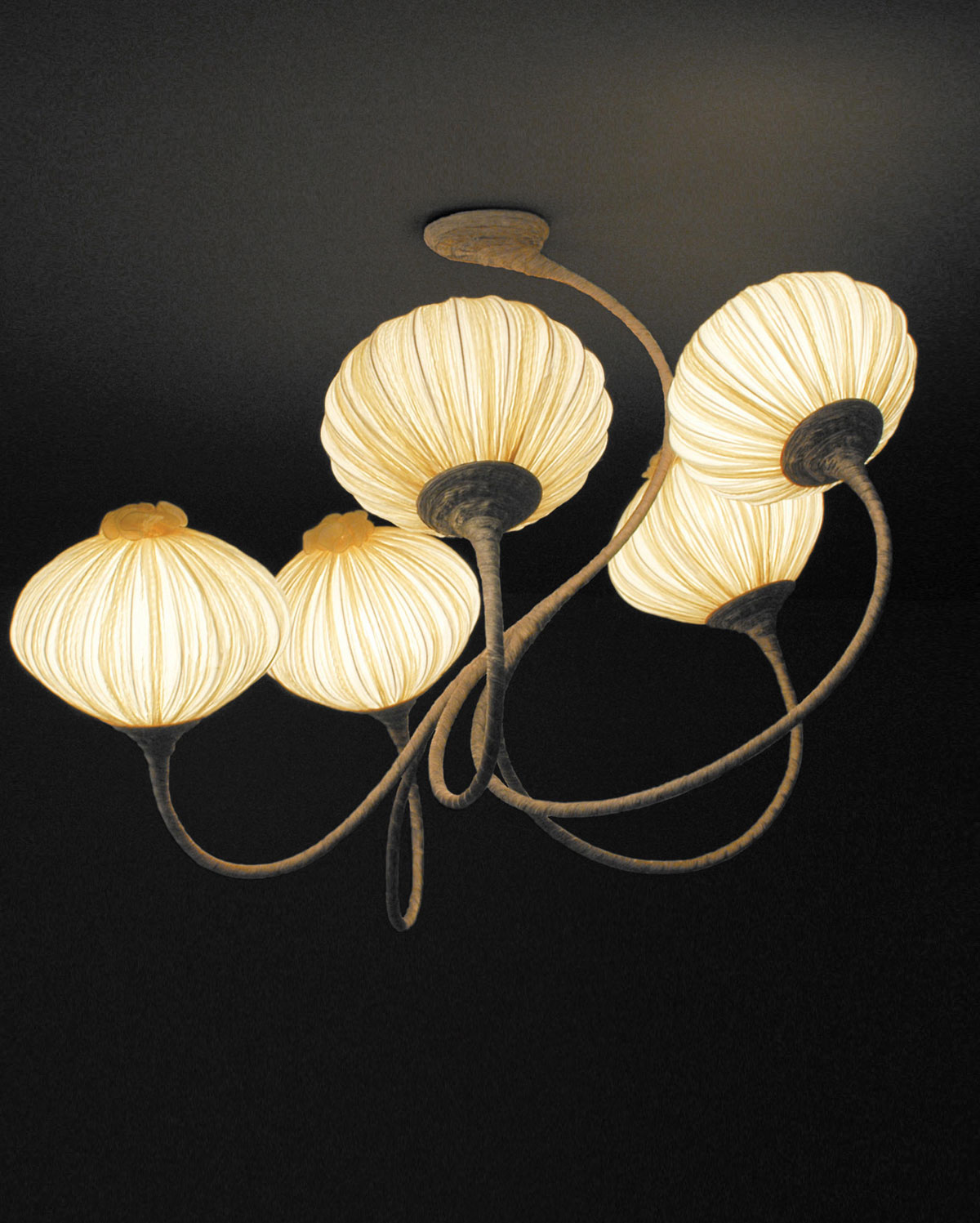 Die Aqua Creations Palms Pendelleuchte ist inspiriert von der Natur und spielt optisch mit Beweglichkeit. Das Design, welches Ayala Serfaty gestaltete, weckt Erinnerungen an Zweige mit Büten in überdimensionaler Größe, aber auch an die früheren 50er Jahre. Ebsenso könnte die Leuchte auch aus Literaturklassiker oder dem Fantasy-Genre entsprungen sein. Die stark stilisierte Verästelung besteht aus handgebogenen Metallrohren, die mit dunkelbronzefarbenem Organza-Stoff umwickelt wurden. Die Lampenschirme in Blütenform werden auf einem Metallgerüst von Hand mit plissierter Seide aufgezogen und in Form genäht. Alle Schirme können abgenommen werden.