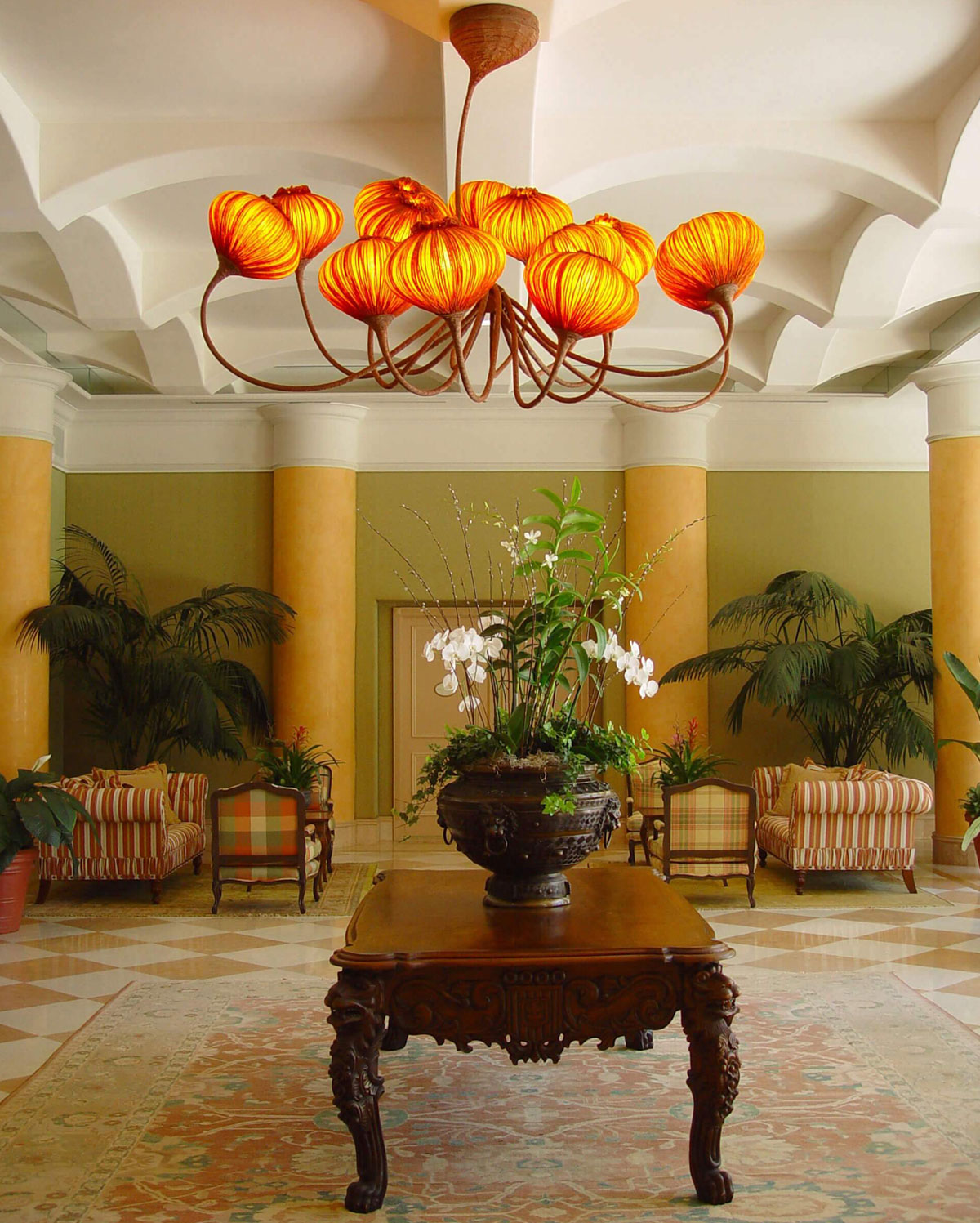 Der Aqua Creations Palms Kronleuchter ist in drei verschiedenen Varianten erhältlich. Wählen Sie die Palms Leuchte mit drei, fünf oder neun Leuchtschirmen. Dank der handgefärbten, leicht schattierten Seide erzeugt die Palms Pendelleuchte ein angenehmes harmonisches Licht im Interior. Die zur Fertigung verwendeten Naturmaterialien sind äußerst resistent gegen Schimmel und Feuer. Bitte beachten Sie, dass die Farbgebung der Seide abweichend sein kann, da von Hand gefärbt wird. Um die Farbechtheit und Schönheit des Materials zu erhalten, empfiehlt der Hersteller die Leuchten vor direkter Sonneneinstrahlung und Rauch zu schützen.