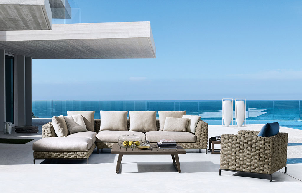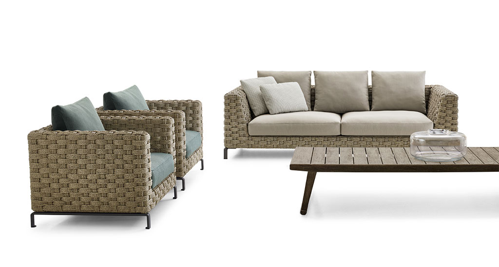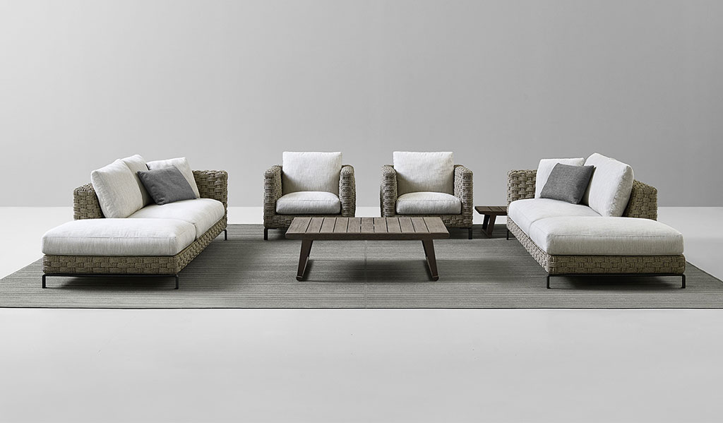 Nach dem großen Erfolg im Indoor-Bereich gibt es die Sitzmöbel Ray von Antonio Citterio jetzt auch für den Außenbereich, in Form der beiden Kollektionen "Natural" und "Fabric". Die Serie Ray Outdoor Natural hat ein seilähnliches Flechtwerk, das an Abaka erinnert und für eine harmonisch-natürliche Ausstrahlung sorgt. Das verwendete Textilene ist perfekt für die Nutzung im Freien geeignet. Ray Fabric Natural gibt es sowohl mit Füße aus fließgepresstem Aluminium als auch Untergestell aus Teak. Die Sitzmöbel der Kollektionen "Natural" und "Fabric" bestehen aus Sofas, die in zwei Tiefen erhältlich sind und mit verschiedenen Modulen aus Endelementen, Chaise Longue und Sessel kombiniert werden können.