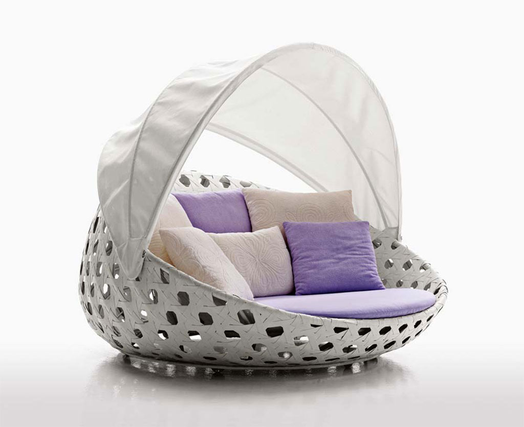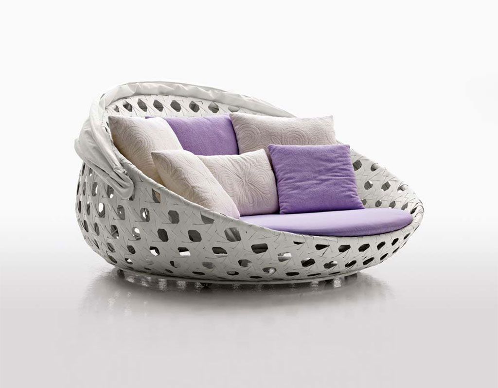 Ein lineares Sofa in zwei Versionen mit hoher und niedriger Rückenlehne, ein Sessel mit den gleichen Alternativen, ein großer runder Sessel und eine Sonnenliege bilden die Canasta-Kollektion. Diese Stühle sind ideal für den Poolbereich oder den Gartenrasen und wie Kunstwerke, die sich in die umliegende Landschaft einfügen.