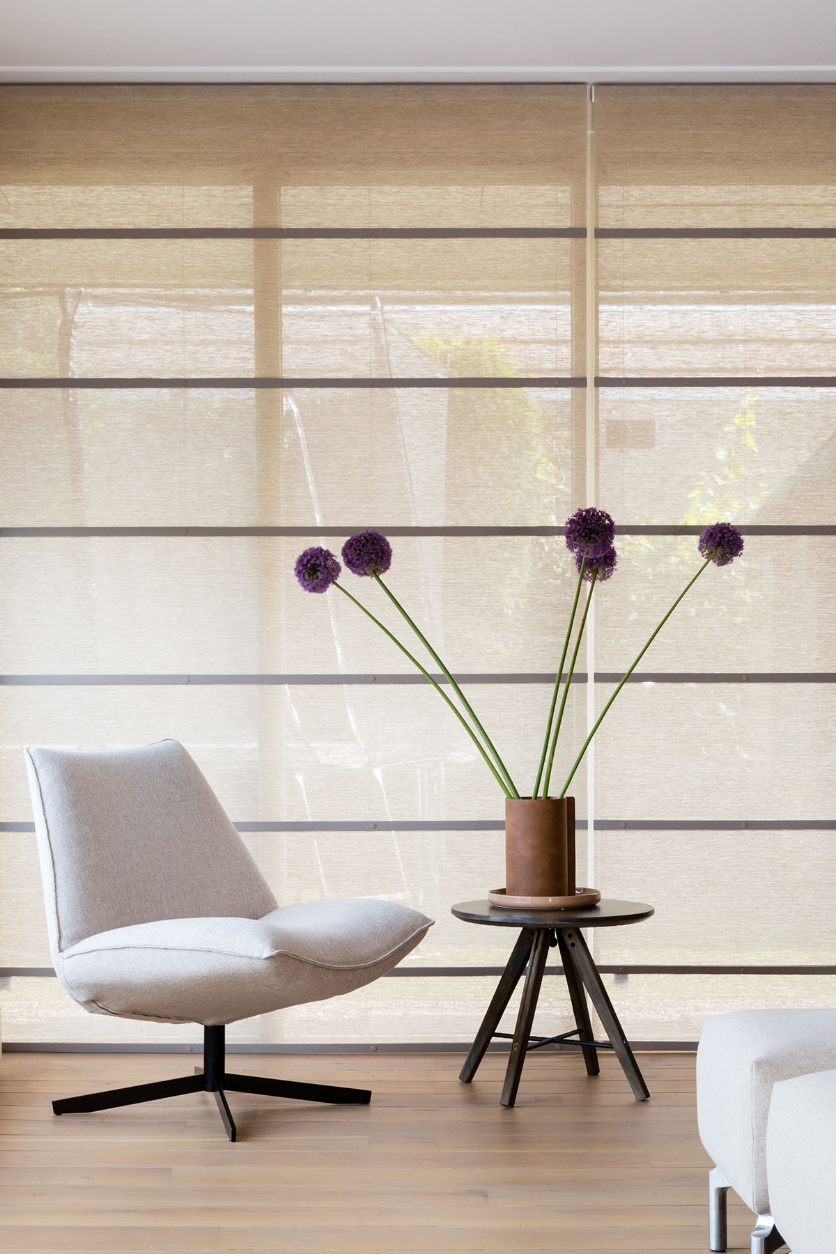 Der vielleicht auffälligste Aspekt der Folds sind die Holzlatten. Passen Sie die Farbe des Textils an die Holzlatten an und Sie stellen einen harmonischen Eindruck her. Oder entscheiden Sie sich für eine kontrastierende Farbabstimmung und Ihr Fenster wird ein wahrer Blickfang. Achten Sie auch auf die Details der Folds, wie die kleinen Knöpfe auf den Latten oder das Papier, das wunderbar in der Oberleiste verarbeitet ist. Und natürlich passen die Raffrollos ausgezeichnet zu unseren Shutters, Jalousien und unseren vertikalen Lamellen.
