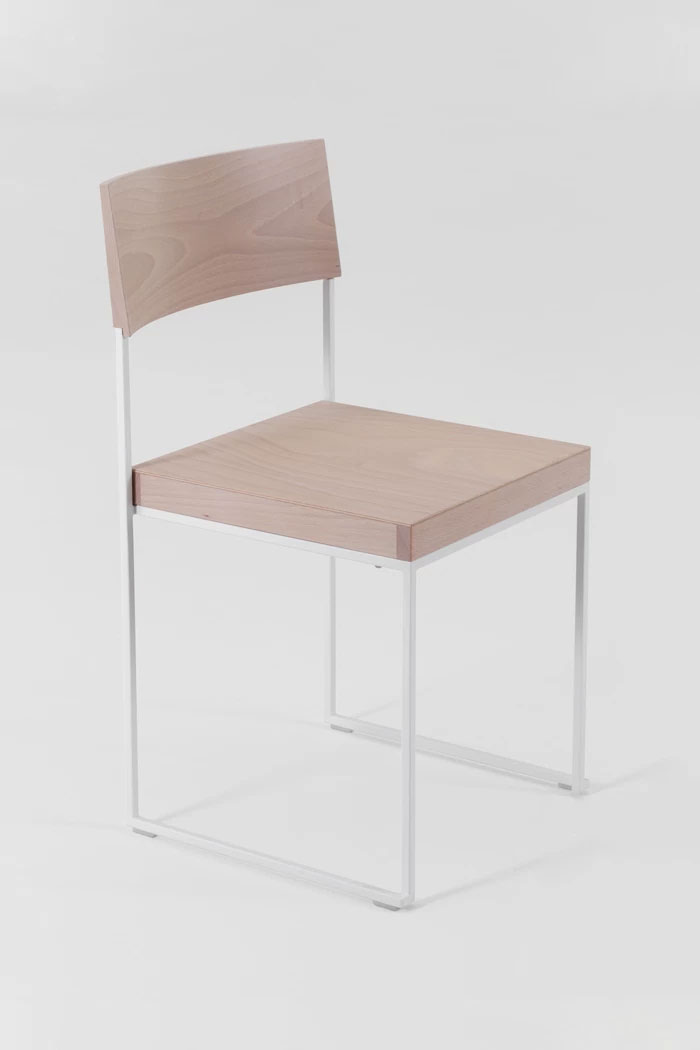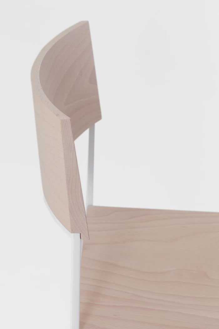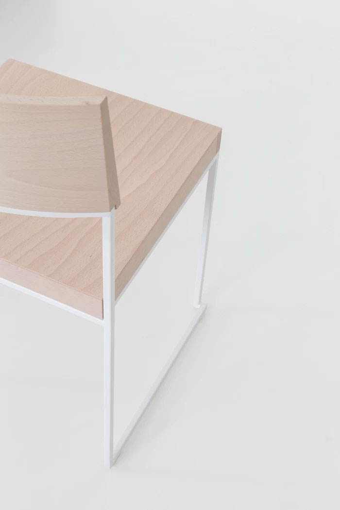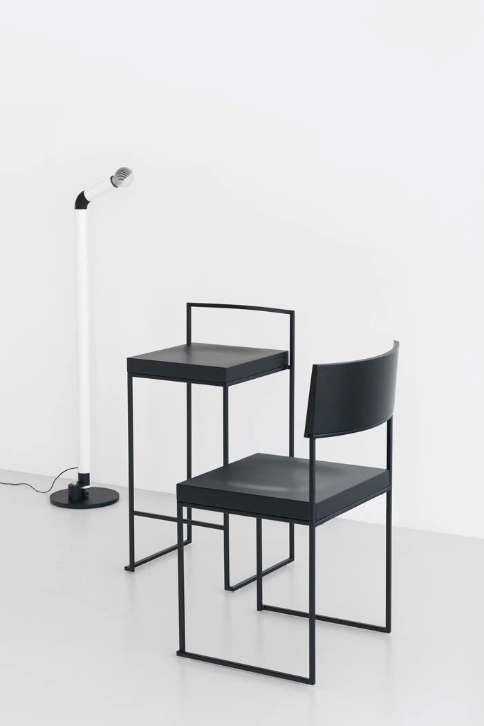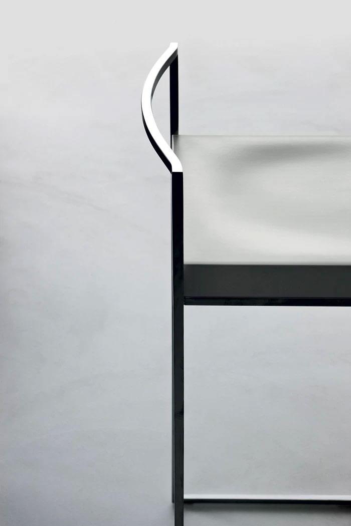 Eine schmale Linie und ein Quadrat sprechen miteinander. Aus dieser Verbindung entsteht ein aus Stühlen und Hockern bestehendes System, deren strenge Schönheit und außerordentliche Schlichtheit dem Sitzflächenprofil und der geschwungenen Wölbung der Rückenlehne geschuldet ist.
