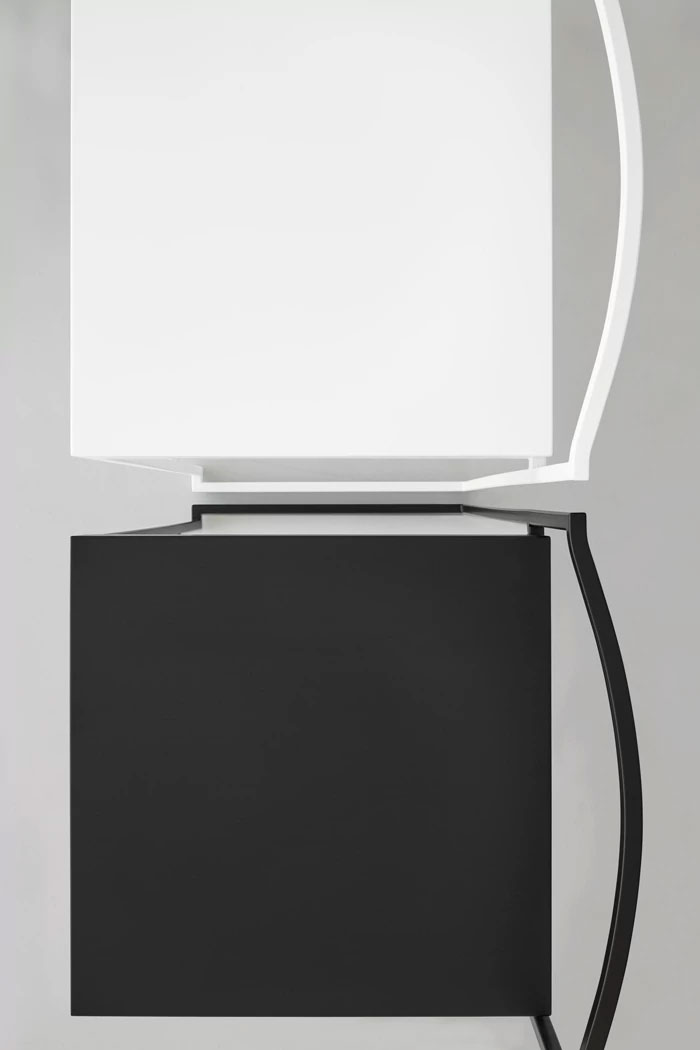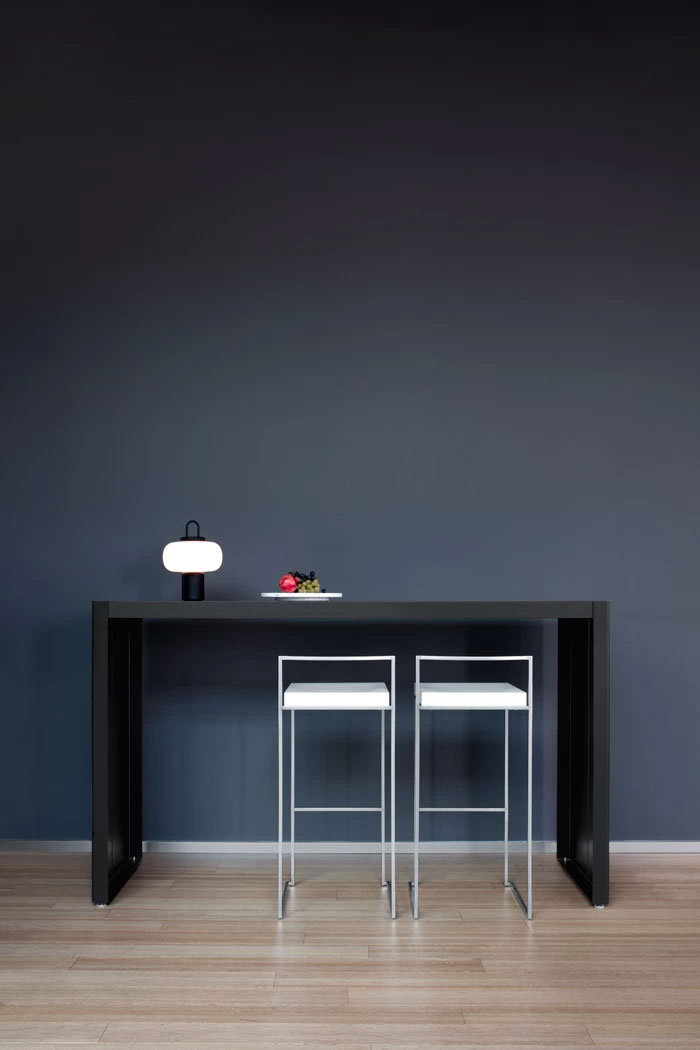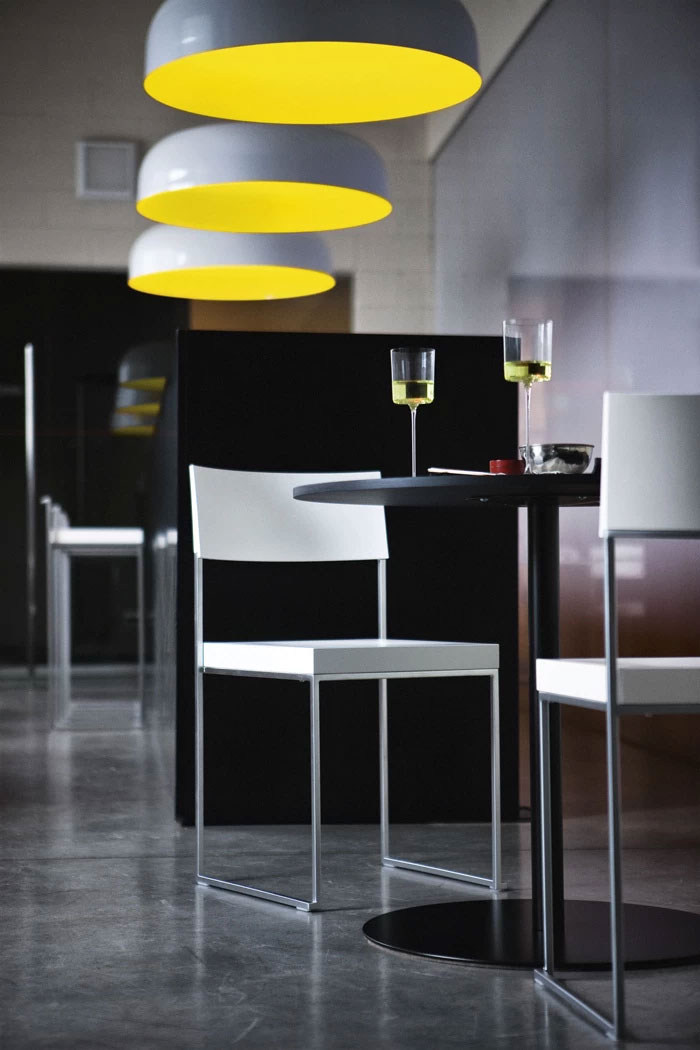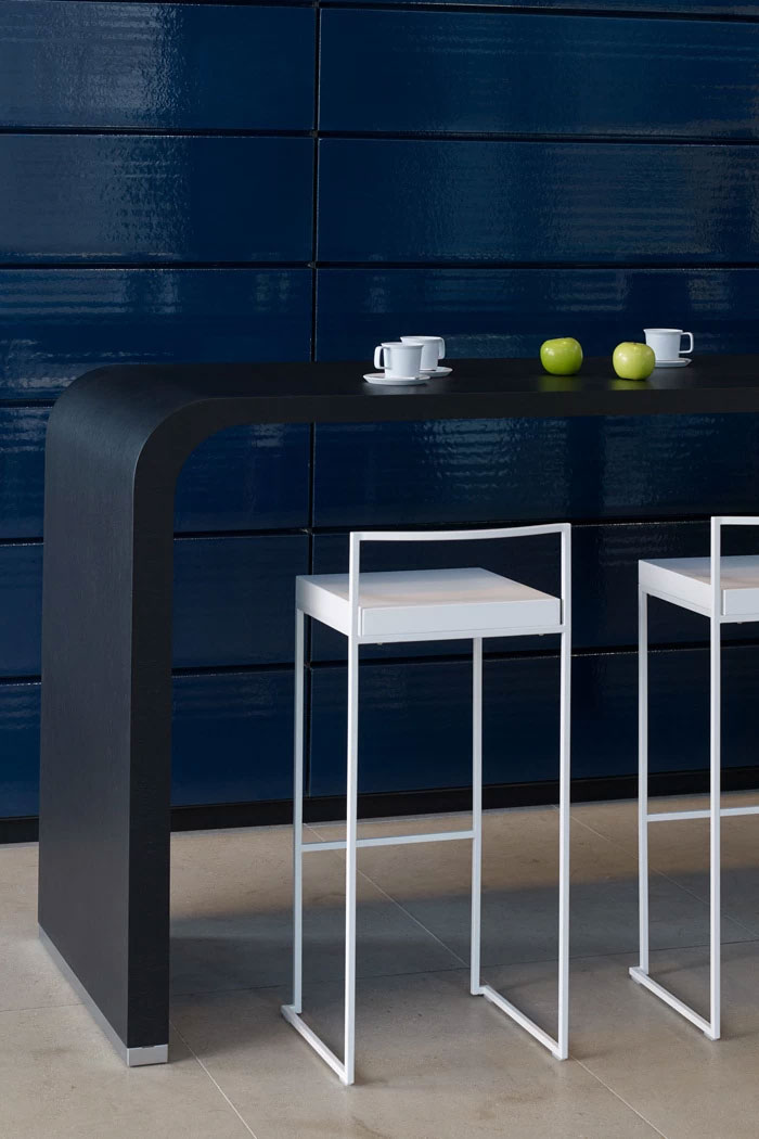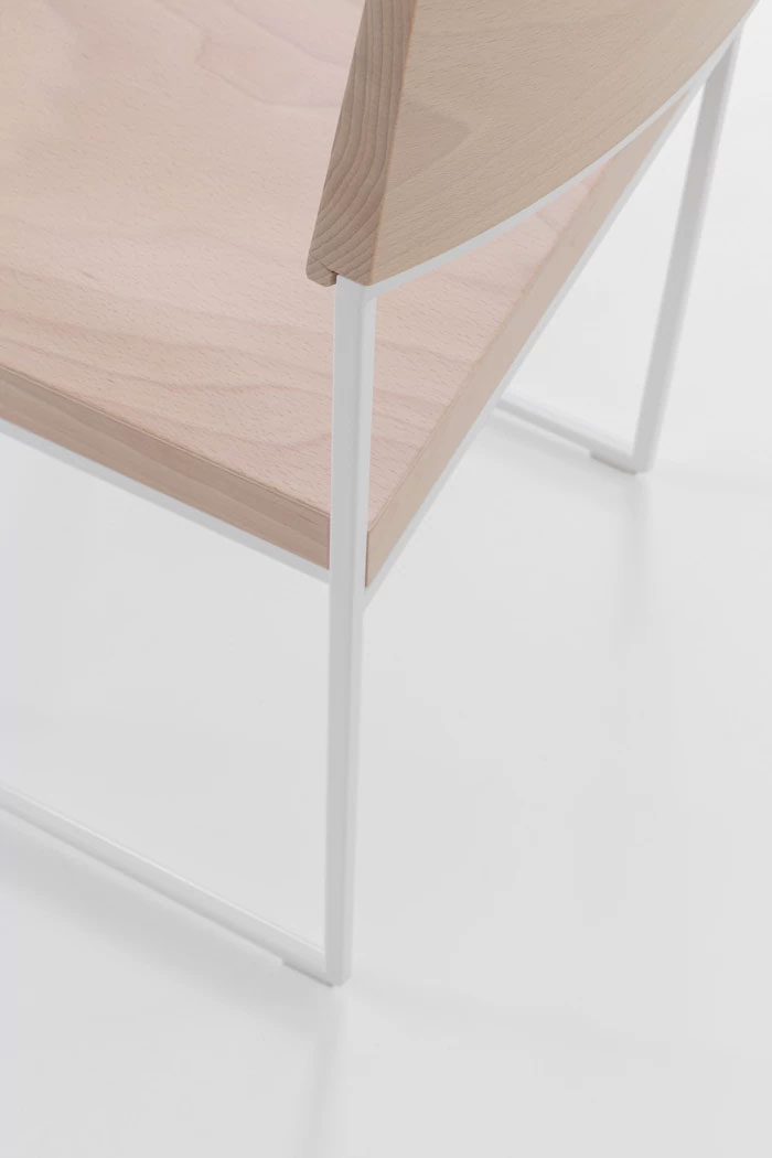 Eine schmale Linie und ein Quadrat sprechen miteinander. Aus dieser Verbindung entsteht ein aus Stühlen und Hockern bestehendes System, deren strenge Schönheit und außerordentliche Schlichtheit dem Sitzflächenprofil und der geschwungenen Wölbung der Rückenlehne geschuldet ist.