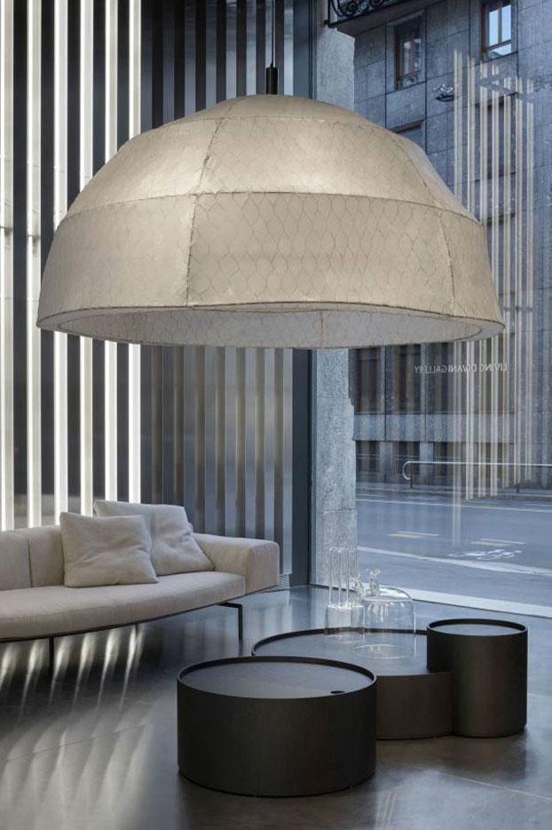 Living Divani Gallery erneuert ihren Look für die Neuvorstellung der 2021 Indoor Collection. Die Inzenierung ist erhaben - ein neutraler Raum, der von den sanften Stimmungslichtern großer und raffinierter Hängelampen aus Reispapier beleuchtet wird. Alle Living Divani-Codes werden in Looks neu interpretiert, die durch reine und weiche Formen gekennzeichnet sind. Eine harmonische Zusammenstellung von Objekten, die mit leichten Variationen und einem raffinierten Moodboard präsentiert werden. Hölzer, Stoffe und Leder in klassischen neutralen Tönen werden durch Farbakzente, lebendige Glanzlackierung und unerwartete Marmoroberflächen belebt.