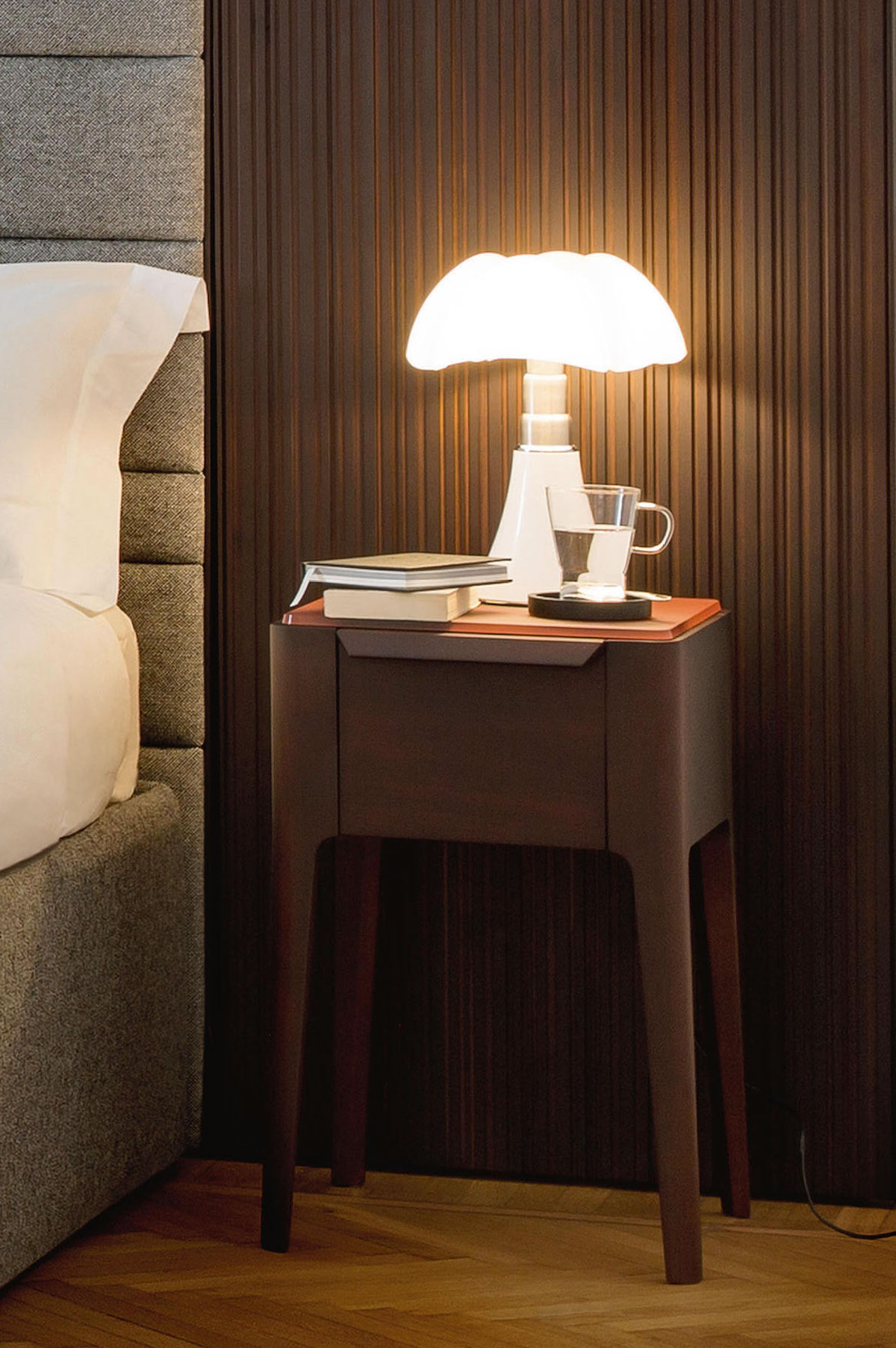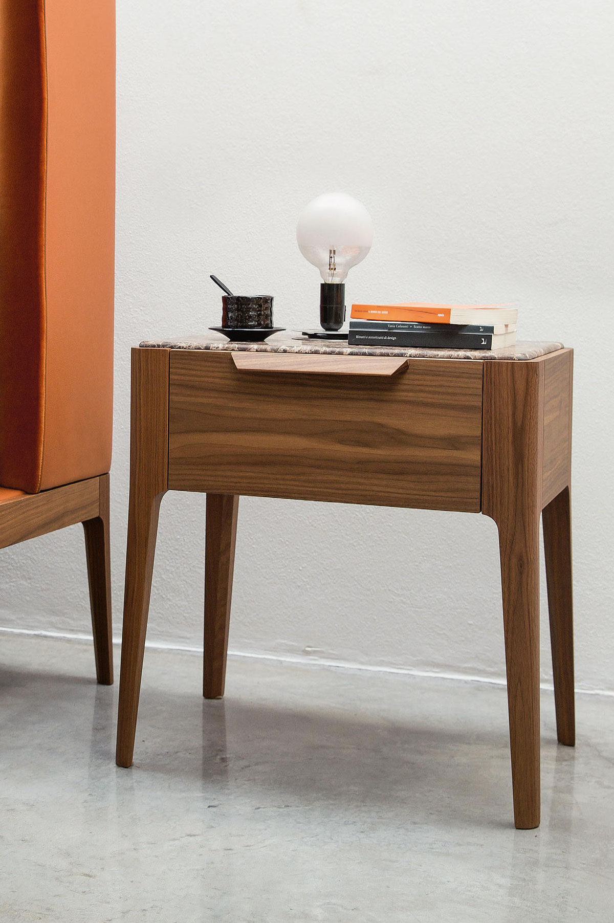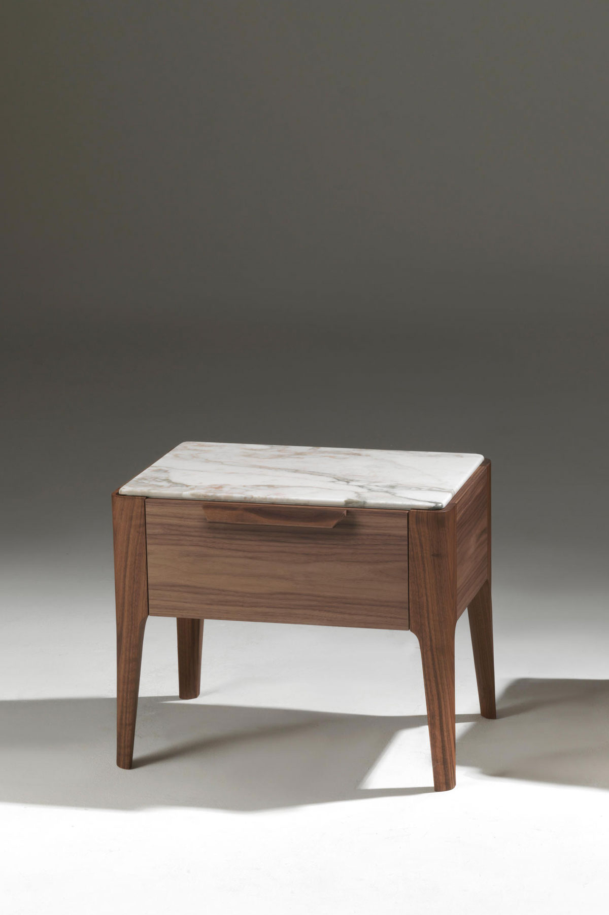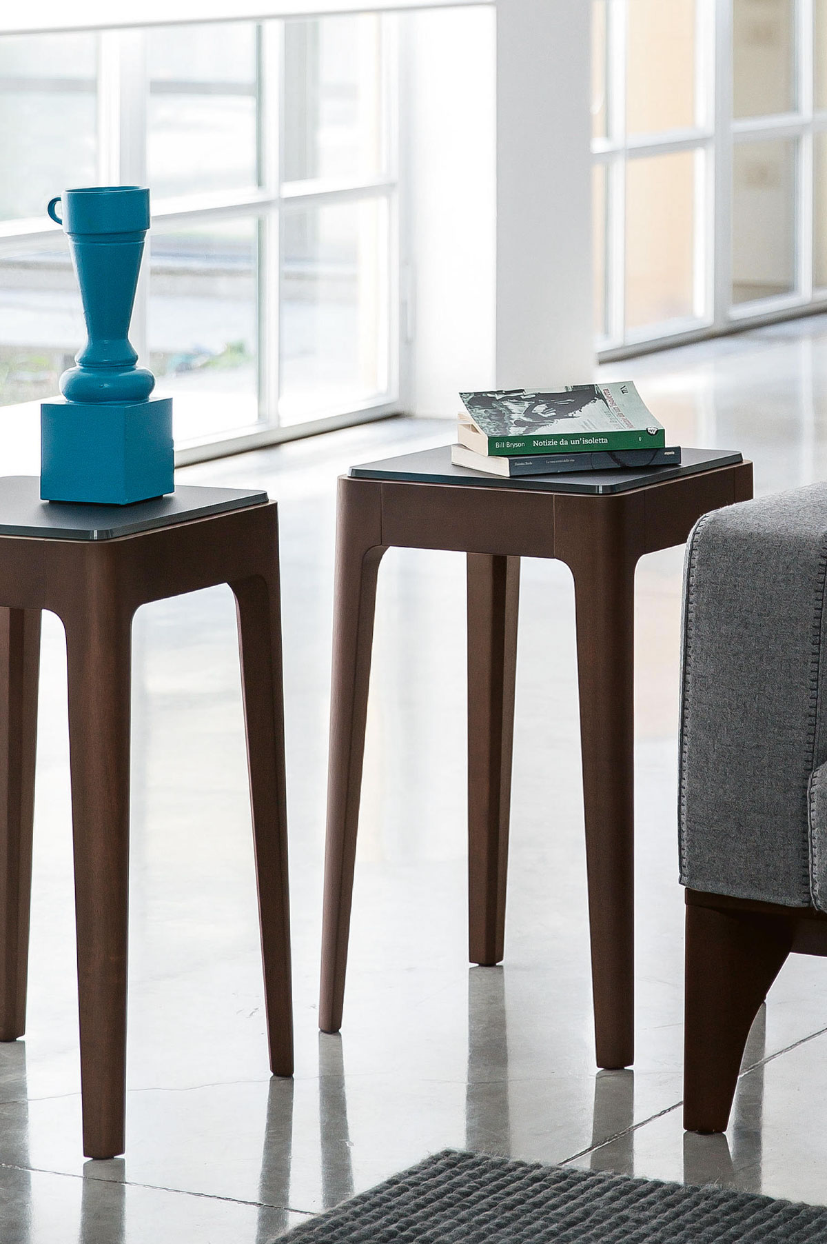 Ziggy Night ist ein Couchtisch/Beistelltisch mit einem Gestell aus massivem Nussbaum Canaletta und wahlweise einer Holz- , Marmor- oder hinterlackierter Glasplatte.