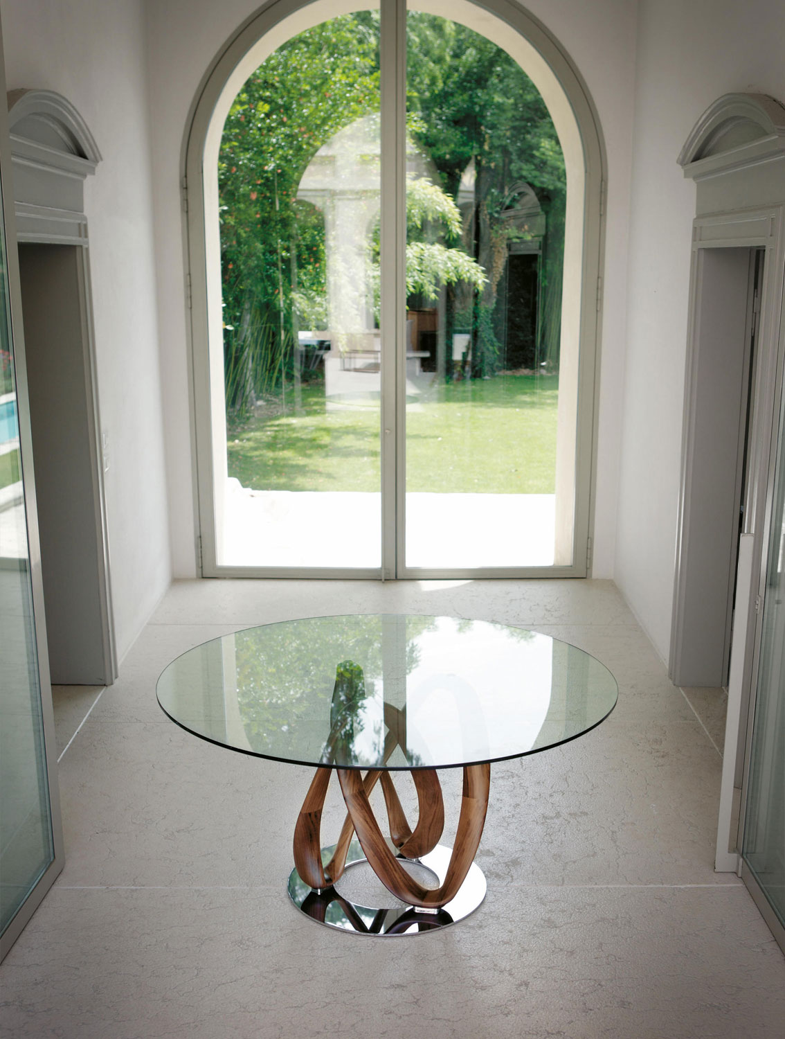 Esstisch mit einem Gestell aus massivem Nussbaum Canaletta oder Esche mit einer Metall- oder ESG-Glasplatte (Stärke 10 bzw. 12 mm).