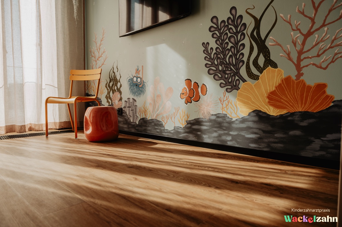 Statt neutraler Flure und steriler Oberflächen begegnen den Kindern Wolken, Figuren und Fantasie-Elemente, die den Blick lenken und automatisch für Ablenkung sorgen. So wird aus dem Zahnarztbesuch ein Erlebnis, das Neugier weckt – und Stress reduziert.
