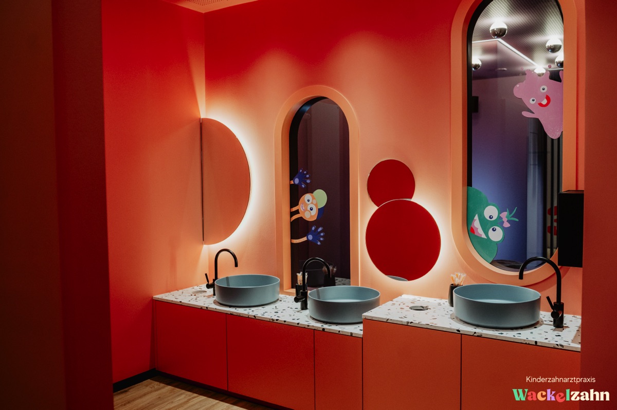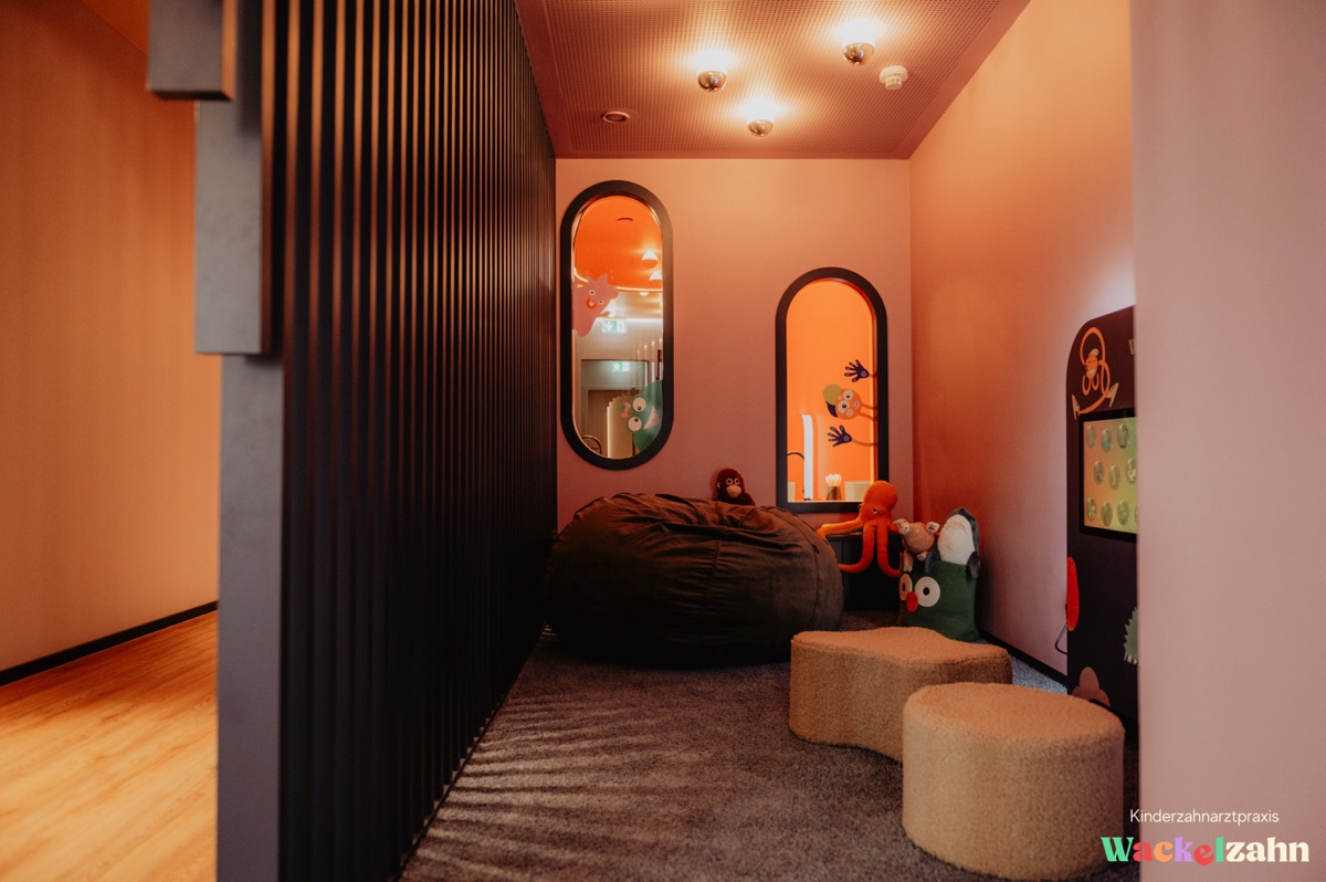 Die Innenarchitektur setzt auf eine freundliche, mutige Farbpalette mit warmen Tönen, die Geborgenheit vermitteln und gleichzeitig modern wirken. Statt klassischem „Kinderarzt-Bunt“ wurde bewusst eine Gestaltung gewählt, die ästhetisch klar bleibt und trotzdem Fantasie zulässt.