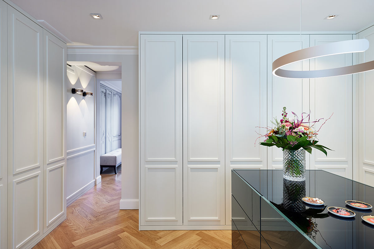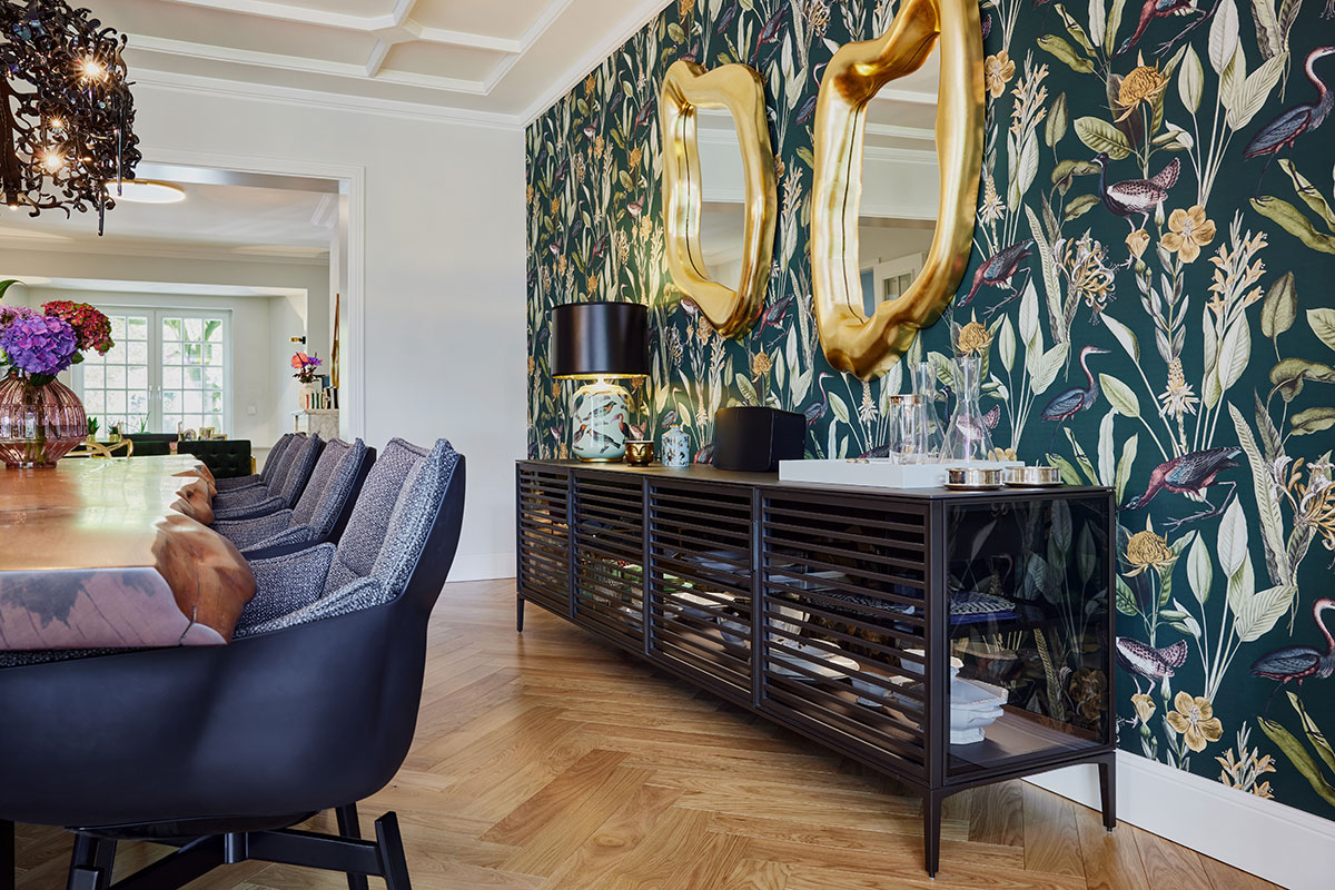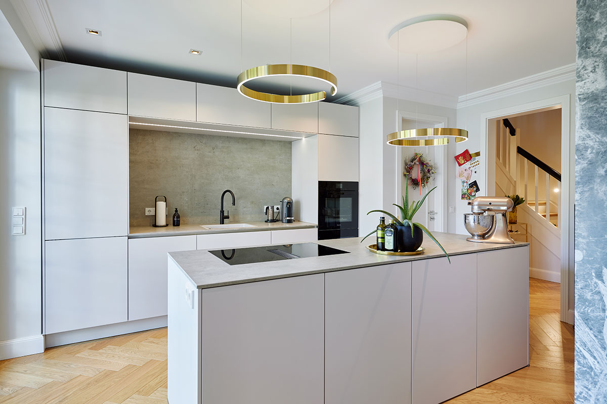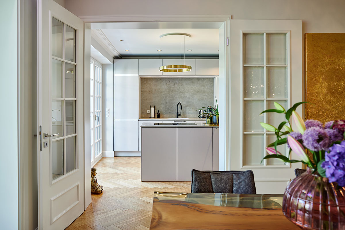 Das Herzstück ist natürlich die Küche mit großer Kochinsel und den verspielten Leuchten von Occhio. Jeder Raum der Wohnung spricht eine individuelle Sprache mit raffiniertem Wanddesign (teils Wall & Deco) und überlegten Accessoires.