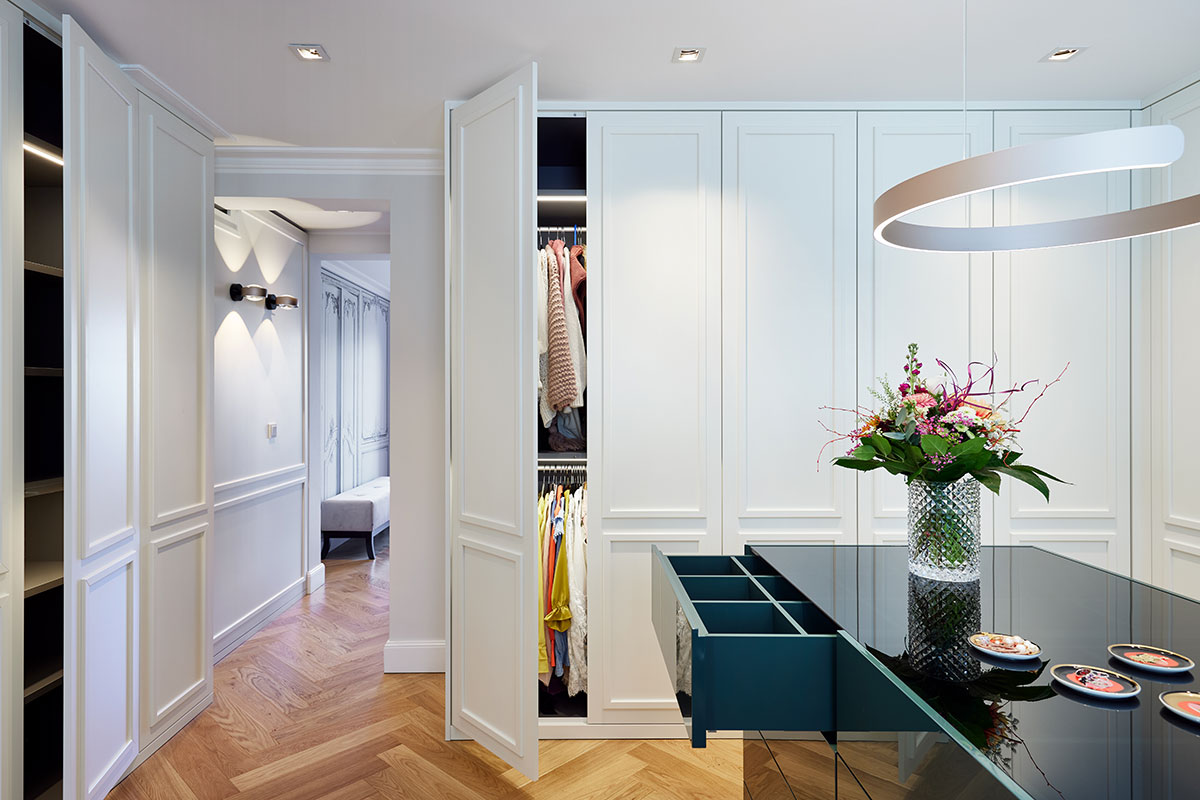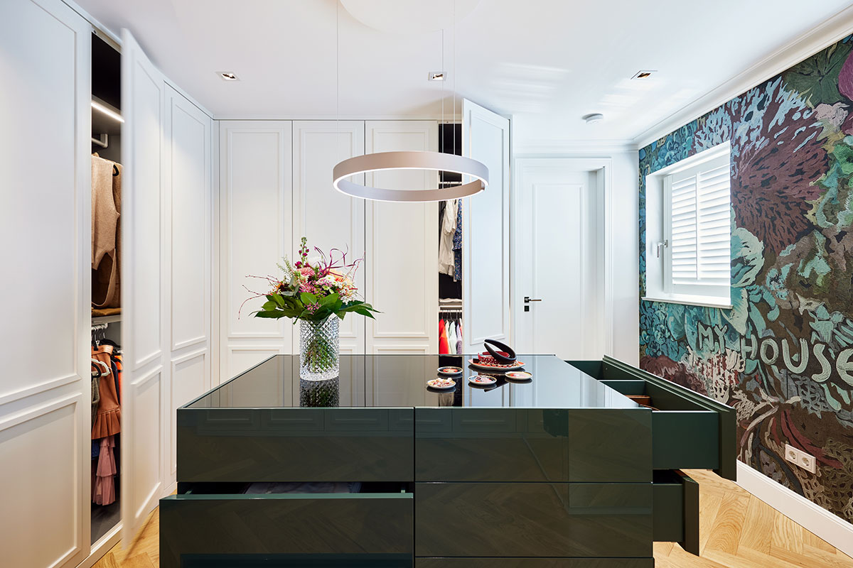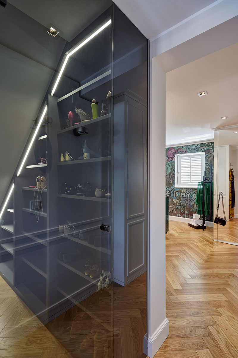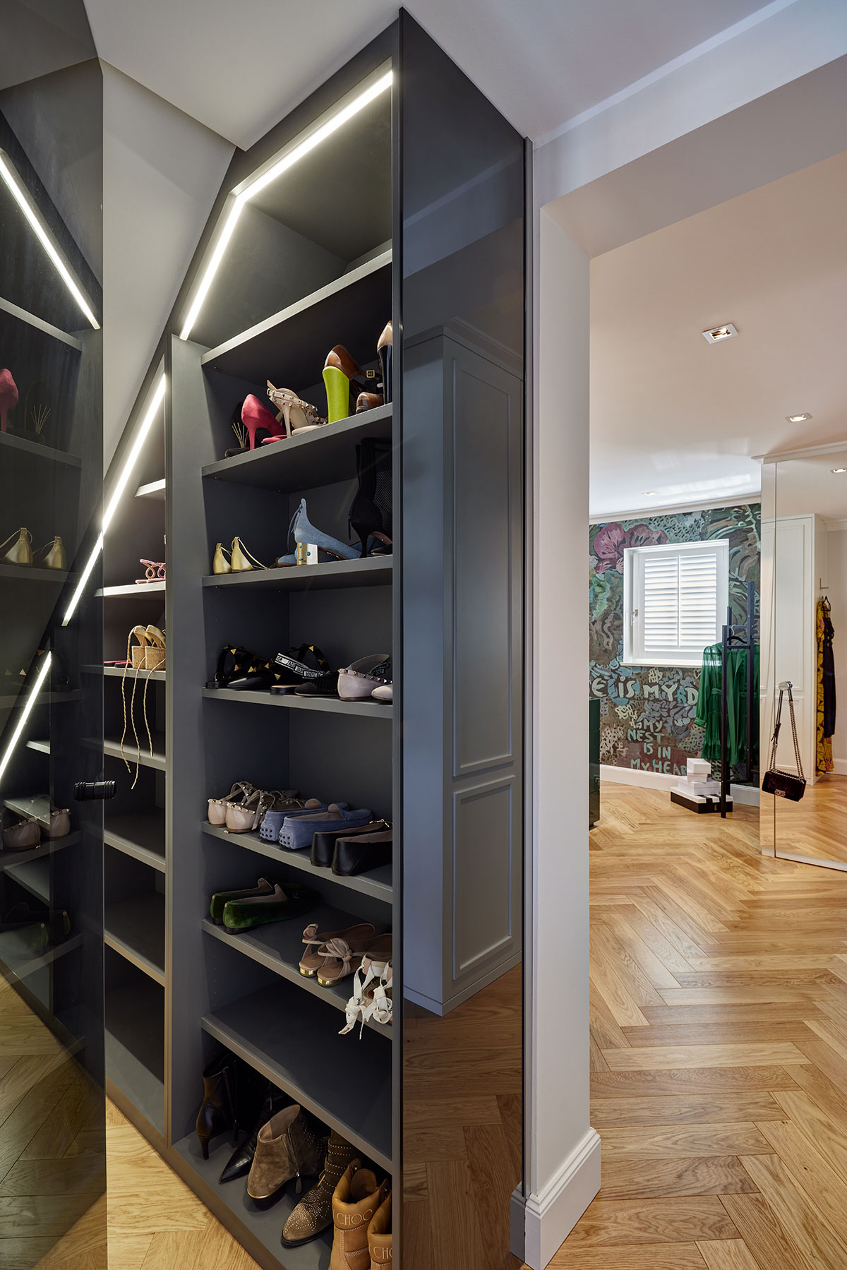 Die begehbare Ankleide ist als Insel mit viel Stauraum gestaltet. In den Durchgang zwischen Schlafzimmer und Ankleide – unter der Dachschräge – wurde passgenau und beleuchtet der massgefertigte Schuhschrank eingebaut: Eine optimale Lösung, den vorhandenen Raum effizient zu nutzen und zugleich ein ungewöhnlicher Blickfang.