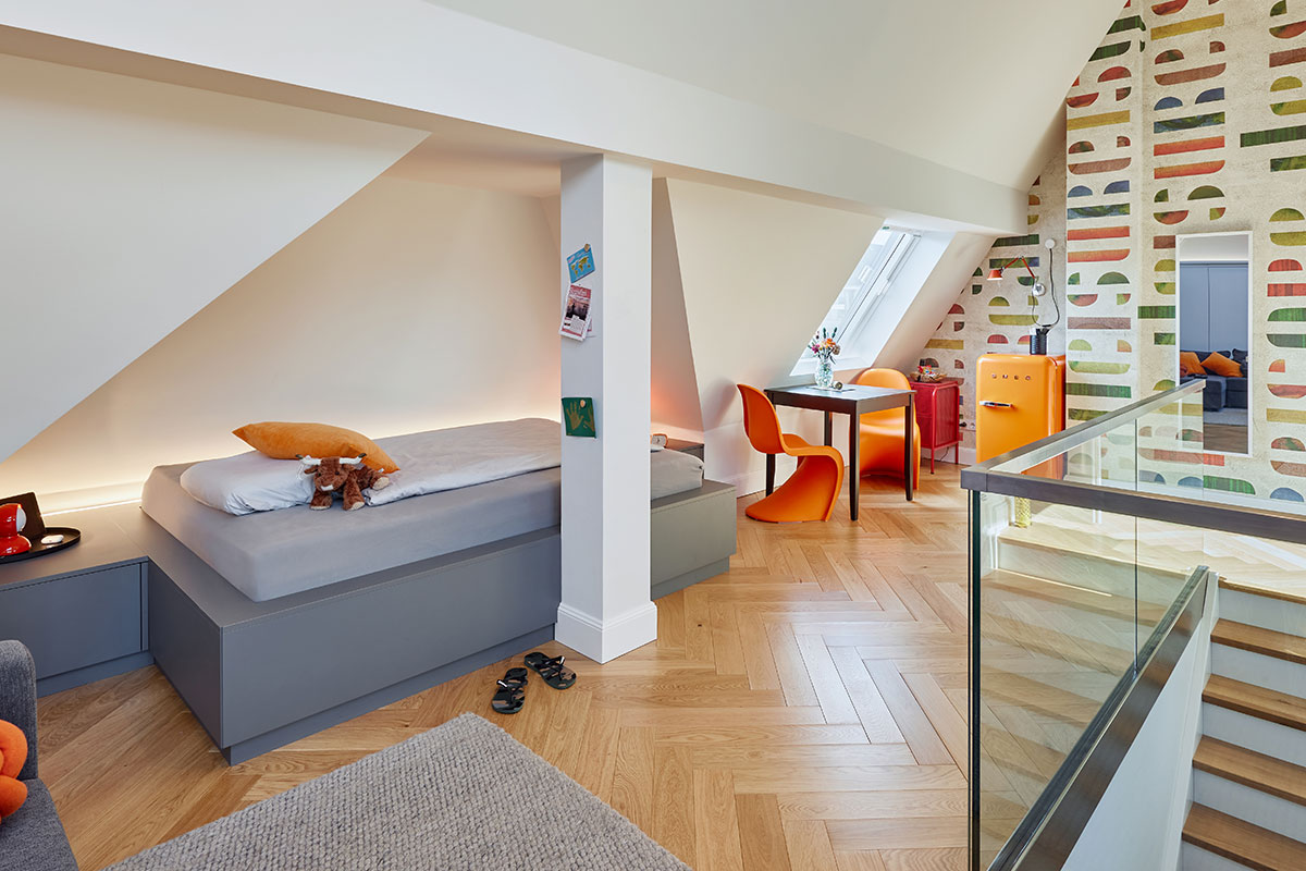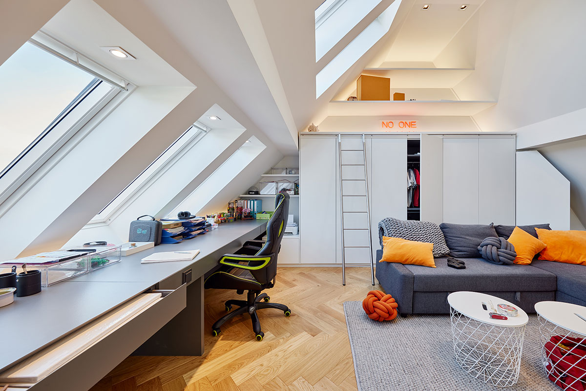 Prinzessin Elna-Margrets Sohn Jonathan hat ein modernes und autarkes Reich mit eigenem Badezimmer und individuell zugeschnittenen Stauraumlösungen erhalten. Der maßgefertigte Schreibtisch bietet viel Platz für Hobbys und Schularbeiten. Der eigens designte und gefertigte Bettausbau und die großzügige Sofalandschaft fügen sich in die lichtdurchflutete Dachschräge ein und nutzen die vorhandene Fläche so maximal aus.