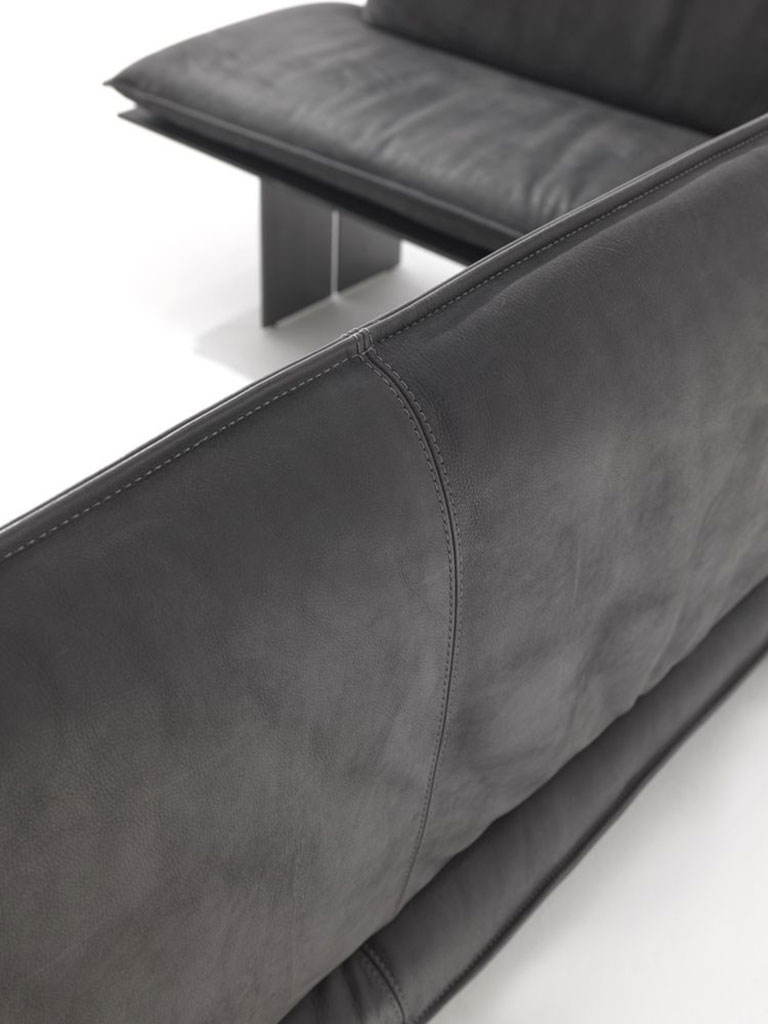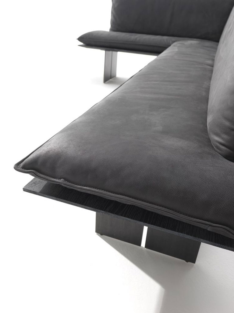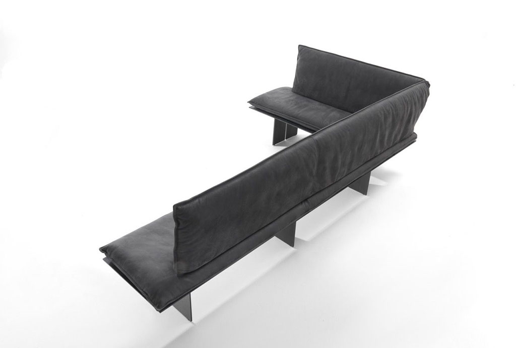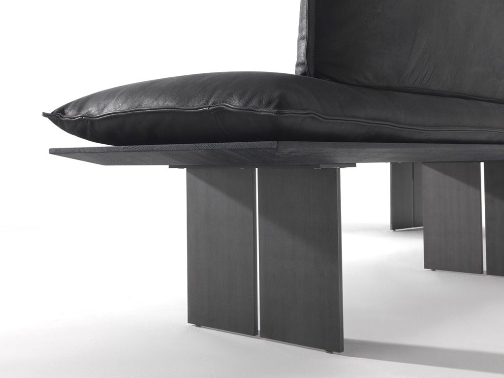Aus Massivholz gefertigte Bank mit angeklebten Leisten und quadratischen Seitenteilen, in Kombination mit Eisenbeinen, die über eine zentrale Fuge verfügen. Sowohl die Sitzfläche als auch die Rückenlehne sind mit überdimensionalen Kissen gepolstert, die mit Leder oder Stoff mit sichtbaren Nähten überzogen sind. Erhältlich in geradliniger oder winkelförmiger Ausführung.