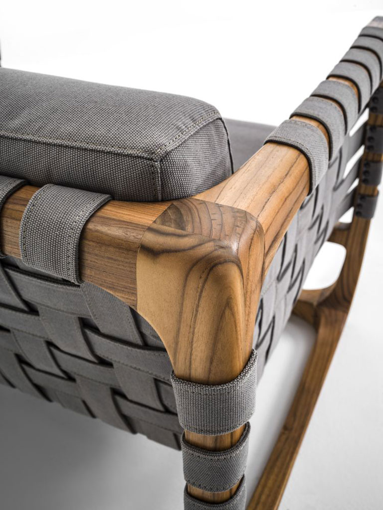 Gepolsterter Sessel mit Gestell aus Massivholz, von Hand gedrechselt, aufgebaut und geschliffen. Besonderes Detail sind die Streifen in Leder oder Stoff unter dem Sitz, auf der Rückenlehne und auf den Armlehnen. Bei der Variante in Stoff sind diese Streifen innen strukturell verstärkt.