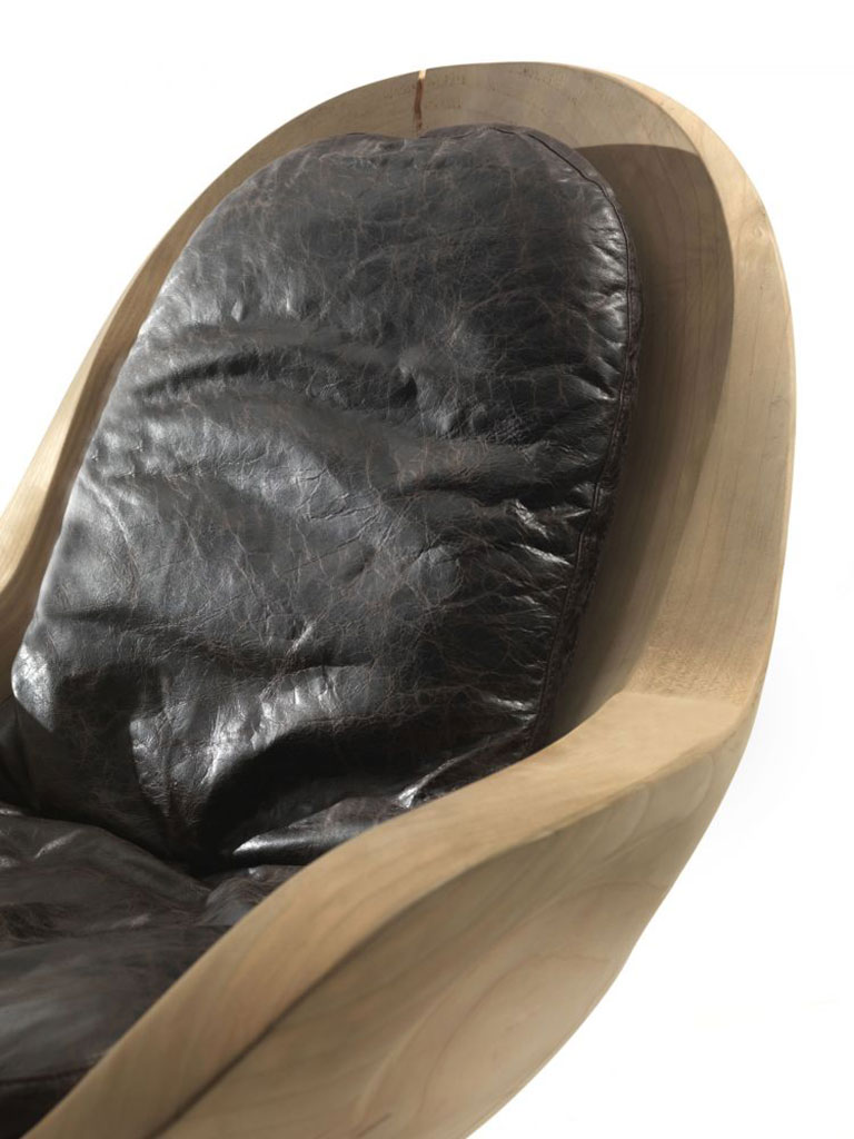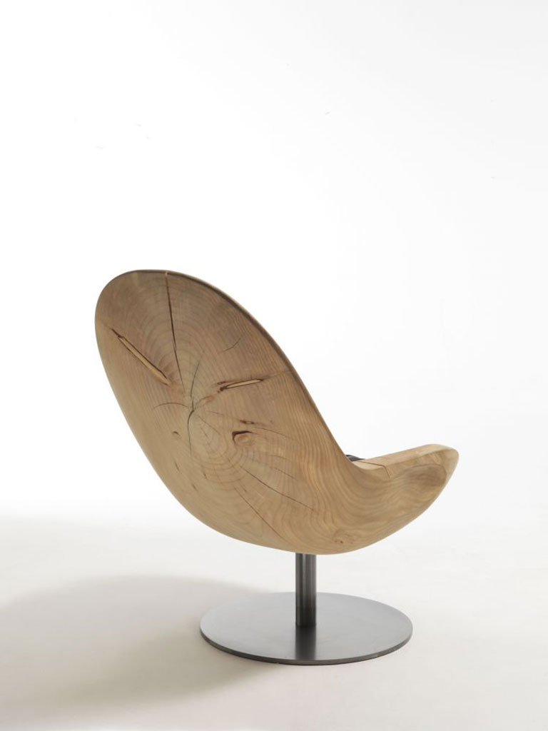 Aus massivem, duftendem Zedernholz aus einem einzigen Block gefertigter Sessel, der sich durch seine bequeme und ergonomische Struktur in weiterführender Ausrichtung zwischen Sitzfläche und Rückenlehne auszeichnet. Auf Anfrage mit Sitzpolster aus Stoff oder Leder mit sichtbaren Nähten. Basis mit rohrförmigem Ständer und Eisenplatte.Hierbei handelt es sich um ein vollkommen natürliches und von Hand gefertigtes, unbehandeltes Möbelstück. Bewegungen, Risse und Veränderungen des Holzes sind eine unentbehrliche Eigenschaft dieses Möbelstücks und sie sind auf die natürliche Setzung und auf unterschiedliche Umweltbedingungen zurückzuführen