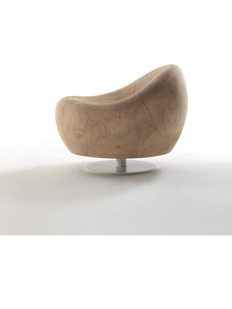 Aus einem einzigen Block massiven, duftenden Zedernholzes gefertigter Sessel. Hierbei handelt es sich um einen skulpturalen Monolithen mit gewundenem und geschmeidigem Design, der sich durch eine ergonomische Sitzfläche in weiterführender Ausrichtung mit der Rückenlehne auszeichnet. Erhältlich mit oder ohne Basis mit rohrförmigem Ständer und Eisenplatte. Hierbei handelt es sich um ein vollkommen natürliches und von Hand gefertigtes, unbehandeltes Möbelstück. Bewegungen, Risse und Veränderungen des Holzes sind eine unentbehrliche Eigenschaft dieses Möbelstücks und sie sind auf die natürliche Setzung und auf unterschiedliche Umweltbedingungen zurückzuführen.