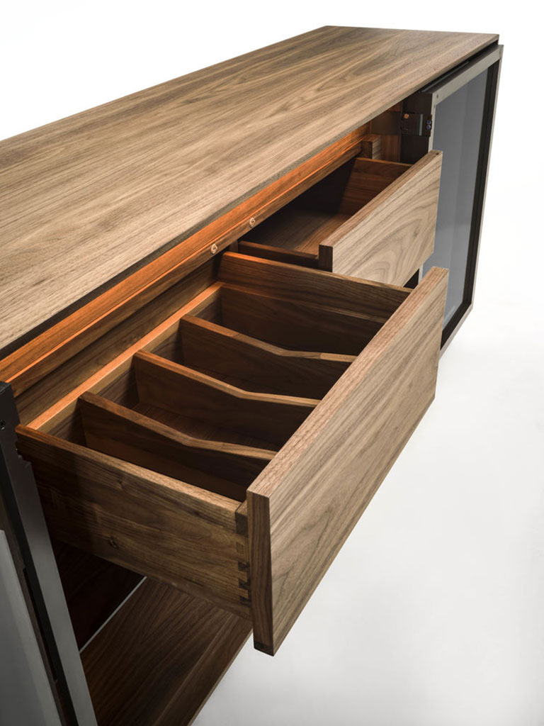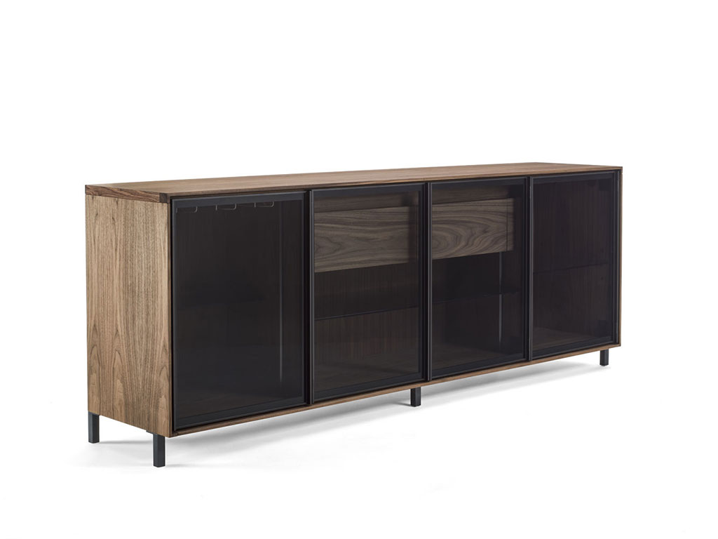 Vielzweckschrank aus Multiplex-Sperrholz, der über vier Türen aus Rauchglas mit Aluminiumrahmen verfügt. Die Ausstattung und das Innenzubehör entsprechen den Anforderungen eines Schrankelements und wurden funktionsgerecht geplant mit zwei Vollholzschubladen mit eingelassenem Griff in Schwalbenschwanzverbindung und mit Soft-Close-Mechanismus sowie mit einer Reihe von Fachböden aus Glas.