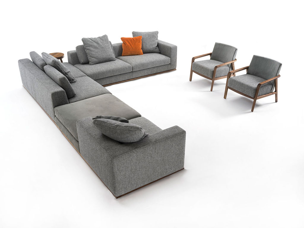 Flexibles und dynamisches Sitzprogramm mit einem starkem Eindruck, das zu jedes Raum passt. Ein Design mit einem ausgewogenem Volumen-Spiel, eine gute Kombination zwischen dem hartem Holzgestell und der Weichheit der Kissen. Viele handwerkliche Details : ein hartes Massivholz-Basis in Kombination mit weichem Kissen, die aus Qualitäts- Nähten und Stoffen bestehen.