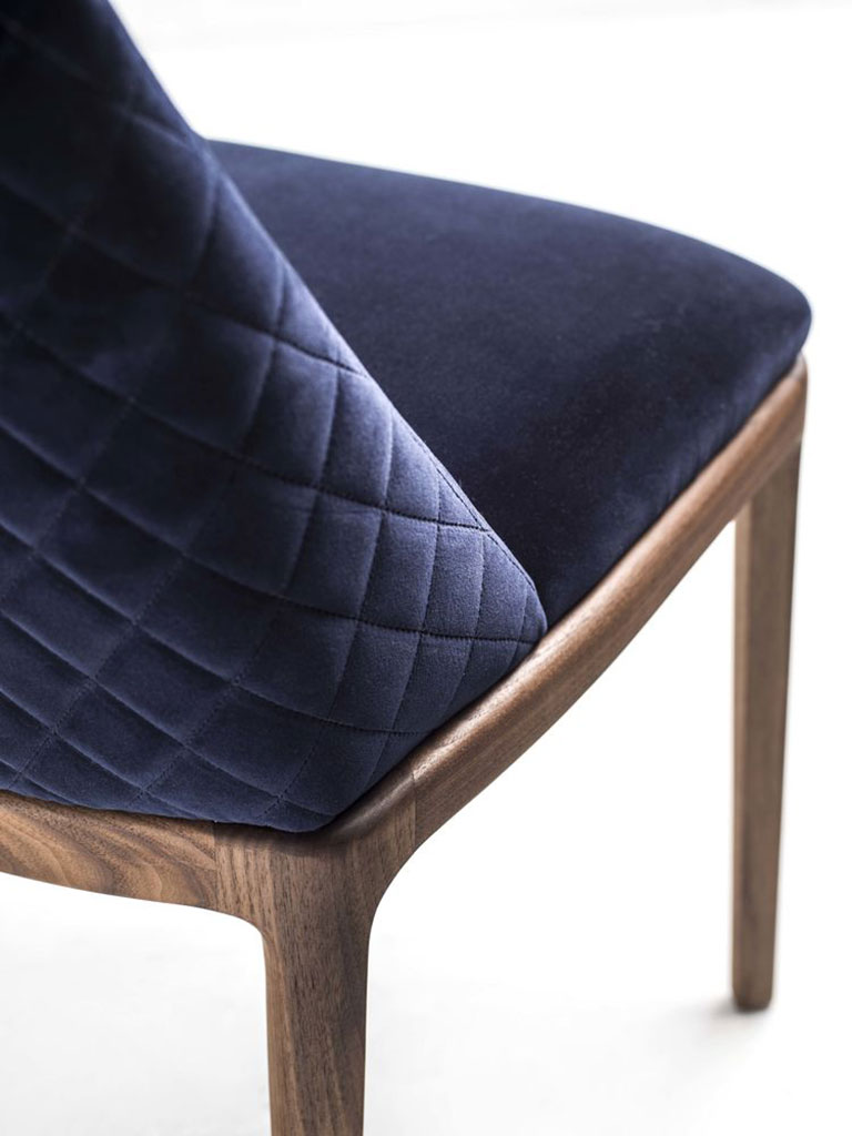 Eleganter Stuhl mit Beinen aus Massivholz, Sitz und Rückenlehne aus Polyurethanschaum. Version ohne Armlehne, mit Leder-, Stoff- oder Samtbezug. Die Rückseite des Bezugs kann glatt oder mit Rautennähten sein.