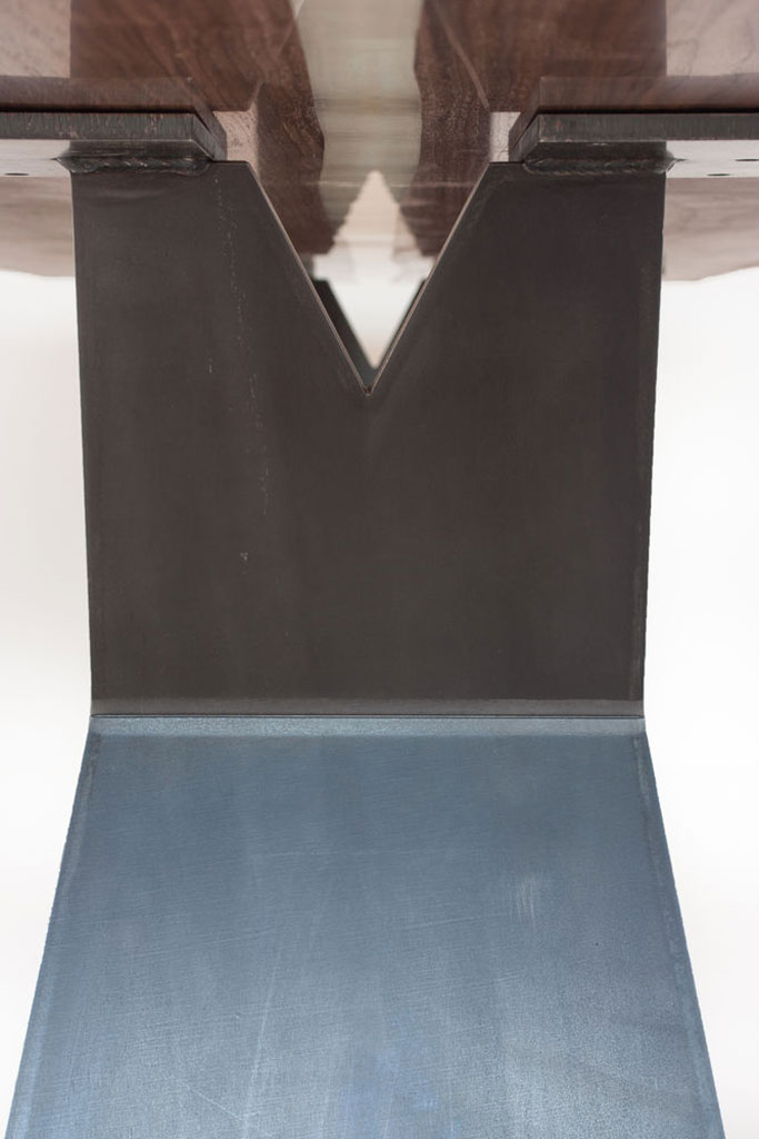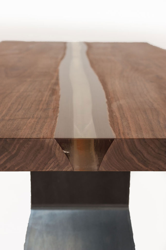 Tischplatte aus Massivholz, bestehend aus zwei Planken mit Naturkanten. Mittelfuge mit transparentem Kunstharz ausgefüllt, Gestell mit geometrischem Design aus Natureisen gefertigt. Mit Öl oder Wachs pflanzlichen Ursprungs mitKiefernextrakten endbehandelt.