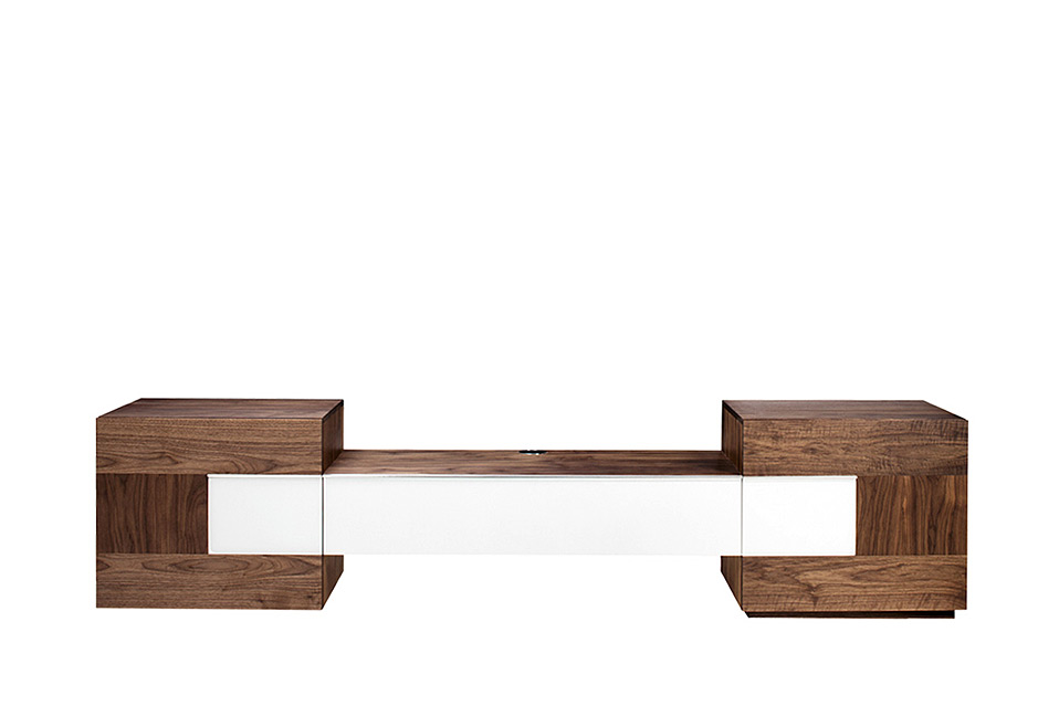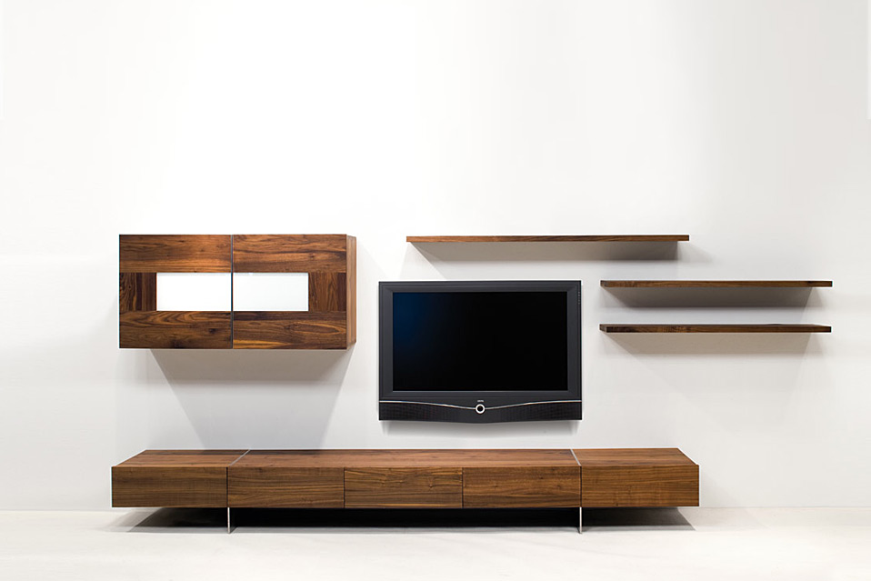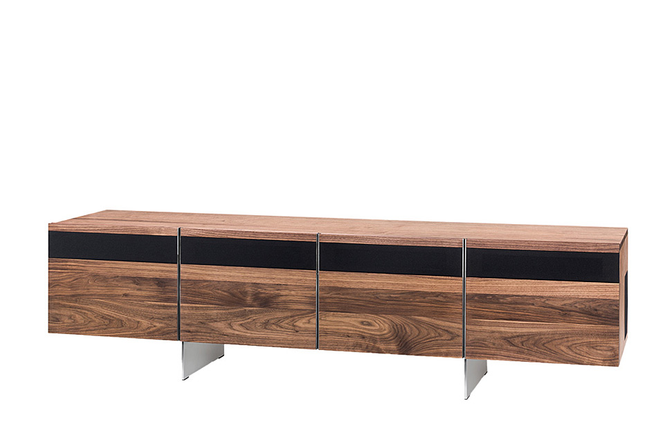 Warmes, naturgemasertes Massivholz in Kombination mit lackiertem Glas und Edelstahl stellen das Gleichgewicht zum flächigen Bildschirm her. Alles überflüssige, technische Gerät verschwindet im geräumigen Innern der Möbel.