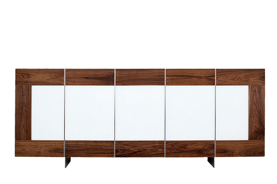 Das Geheimnis dieser Anrichte bleibt jedoch das elegante und wohl proportionierte Design der holzumrahmten Glasflächen und Edelstahlkanten.