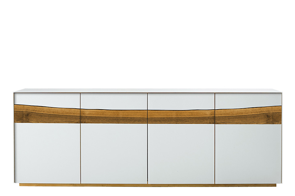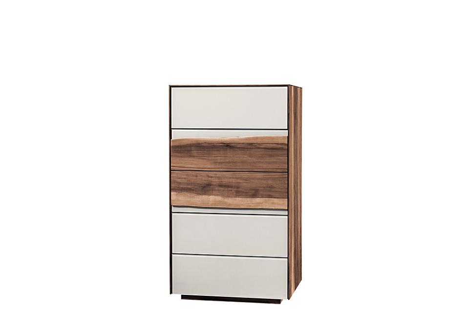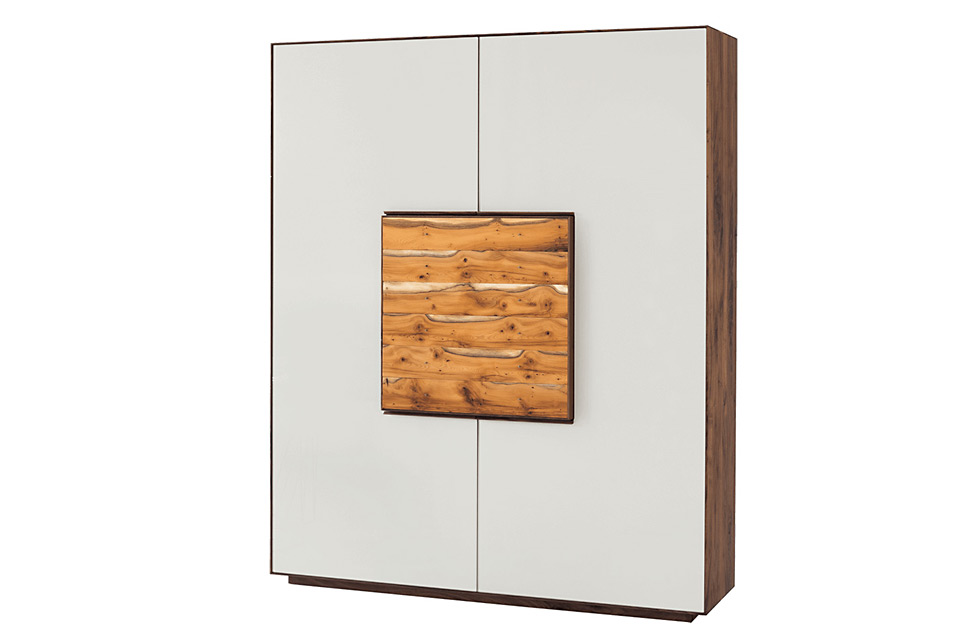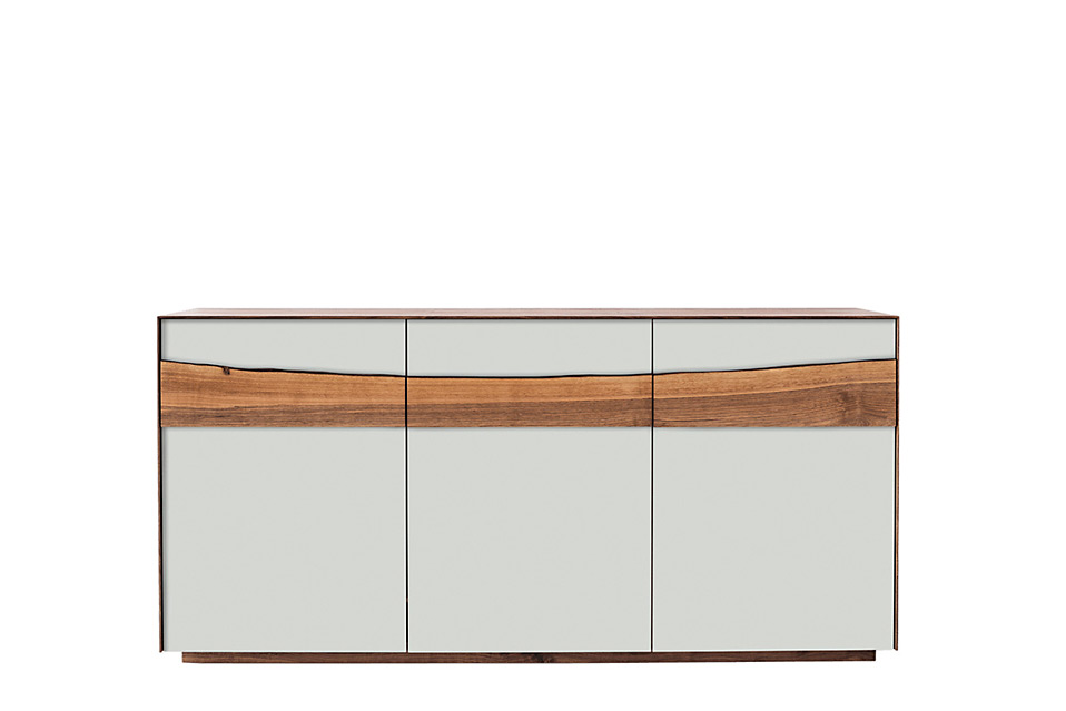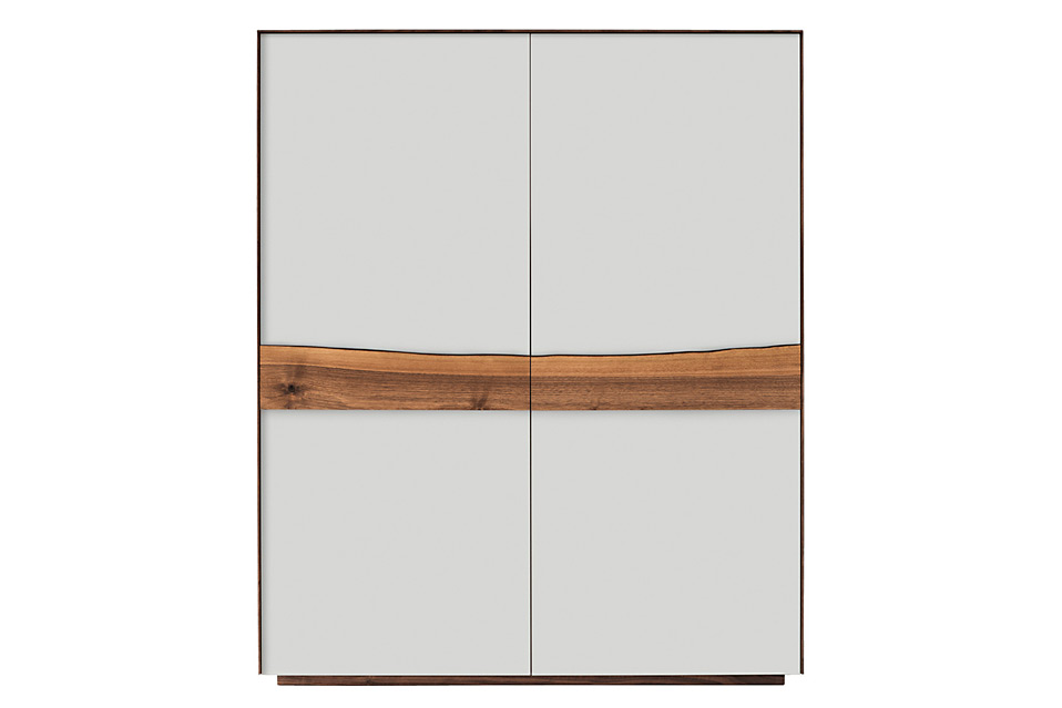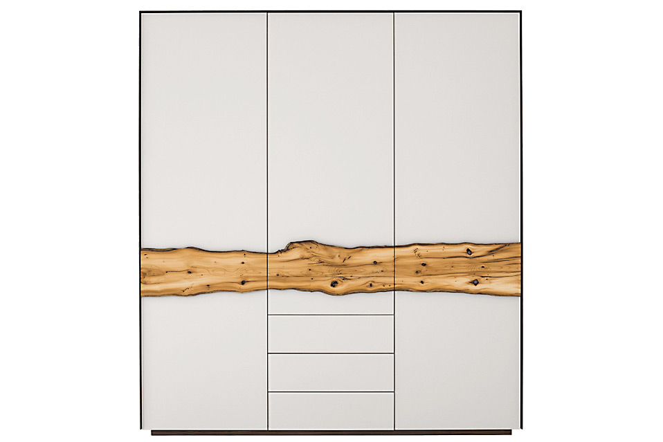 Collection FARN - eine leichte, elegante und zeitlose Korpusmöbel-Variante, die individuellste Gestaltungsmöglichkeiten bietet - die Wahl zwischen unifarbenen Glasoberflächen oder der Kombination aus kühlen Glasfronten mit einer Griff-Applikation aus fein gemaserten Massivhölzern mit naturbelassener Baumkante - das Möbel als individuelles Bild und Kunstobjekt, bei dem die Schönheit der Massivholz-Maserungen zur Schau gestellt wird.