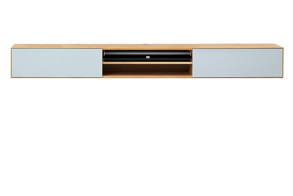 Besonders augenfällig kommt die Schönheit der Materialien, des interessant gemaserten, dunklen Nussbaumholzes und des schneeweißen, kühlen Glases zum Ausdruck und den Flachbildschirm spielend einbindet.