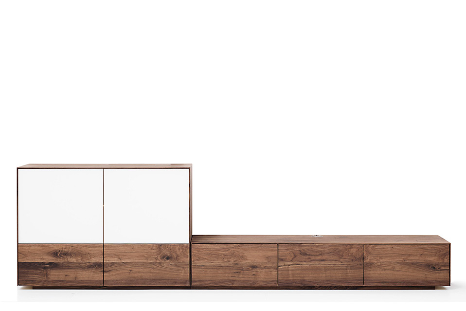 Besonders augenfällig kommt die Schönheit der Materialien, des interessant gemaserten, dunklen Nussbaumholzes und des schneeweißen, kühlen Glases zum Ausdruck. Glas und Holz, die markanten Stilmittel der Collection FARN gehen ein spannungsreiches Verhältnis ein, das ein modernes Ambiente edel einrichtet und den Flachbildschirm spielend einbindet.