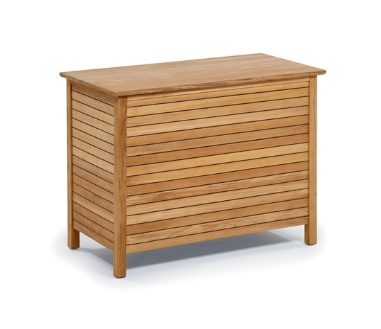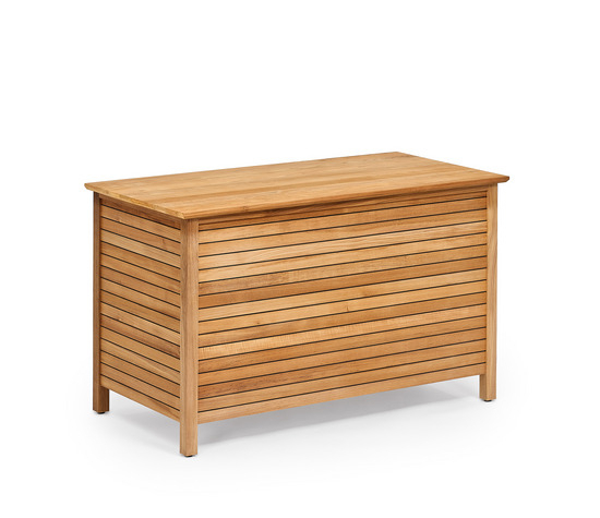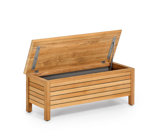 Die Outdoor-Schränke bringen Struktur in diesen Außenbereich und erweisen sich als ebenso attraktive wie funktionale Stauraumlösungen. Zum Sortiment gehören verschiedene Schrankelemente, eine Polstertruhe und ein Pflanzbord. Verarbeitet wird unbehandeltes Teak, dessen Verfugung mit Sikaflex® an die Decks klassischer Segelyachten erinnert. Die Fachböden des Deck Programms sind aus verzinkten, pulverbeschichteten Stahlblechen gefertigt. Rollensätze sorgen darüber hinaus für komfortable Mobilität.